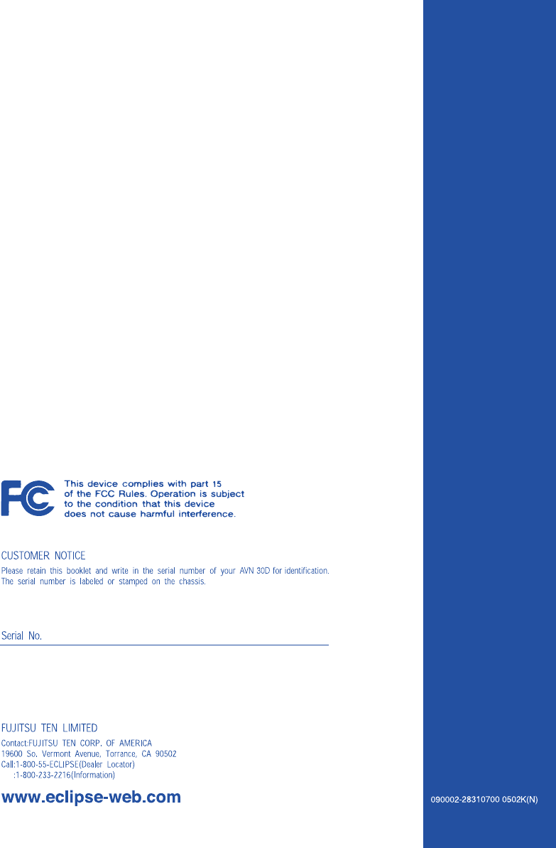 Eclipse Fujitsu Ten Car Stereo System Avn 30D Users Manual 090002 28310700