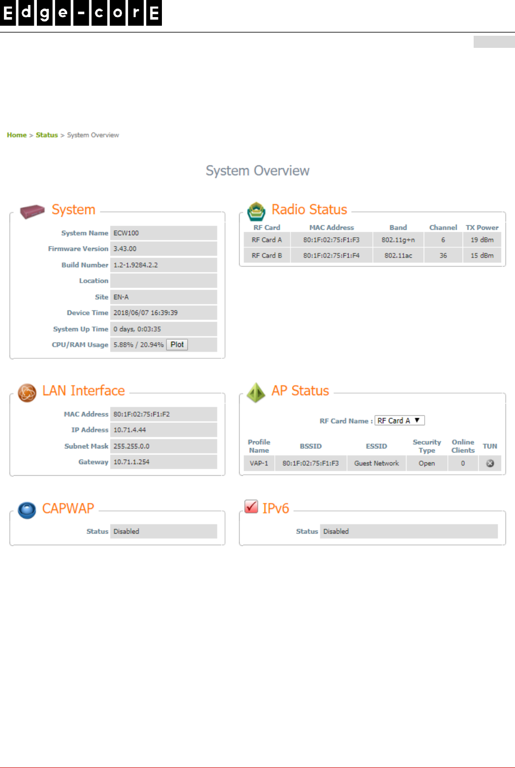 4. After a successful login to ECW100, a System Overview page of the Web Management Interface will