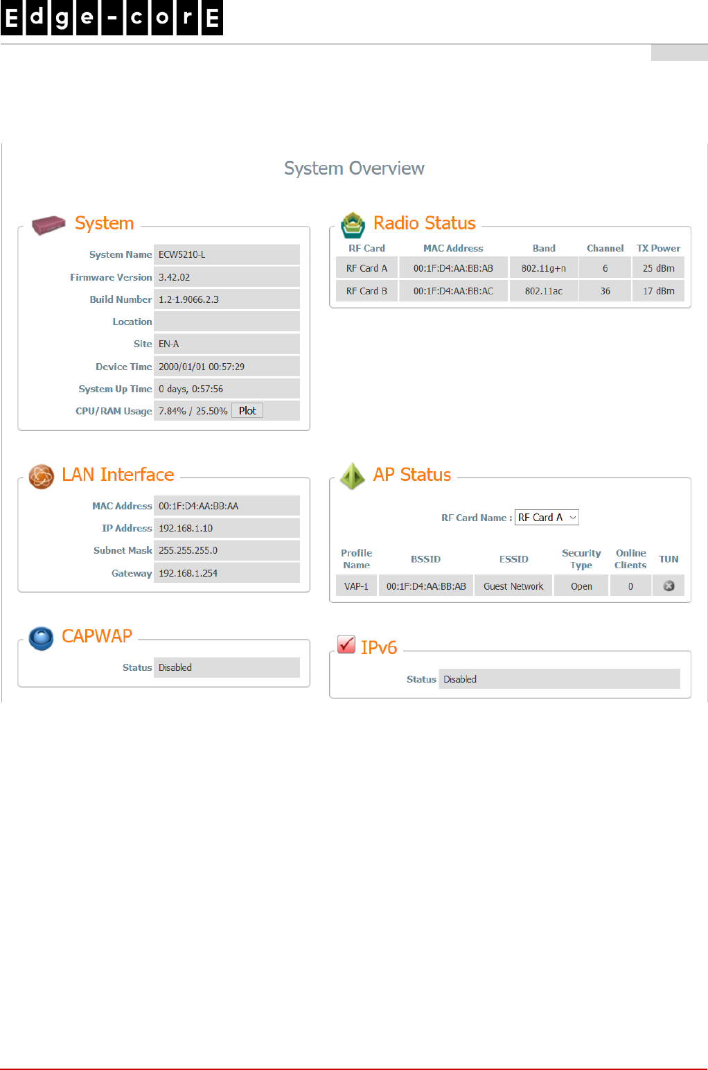 4. After a successful login to ECW5210-L, a System Overview page of the Web Management Interface will