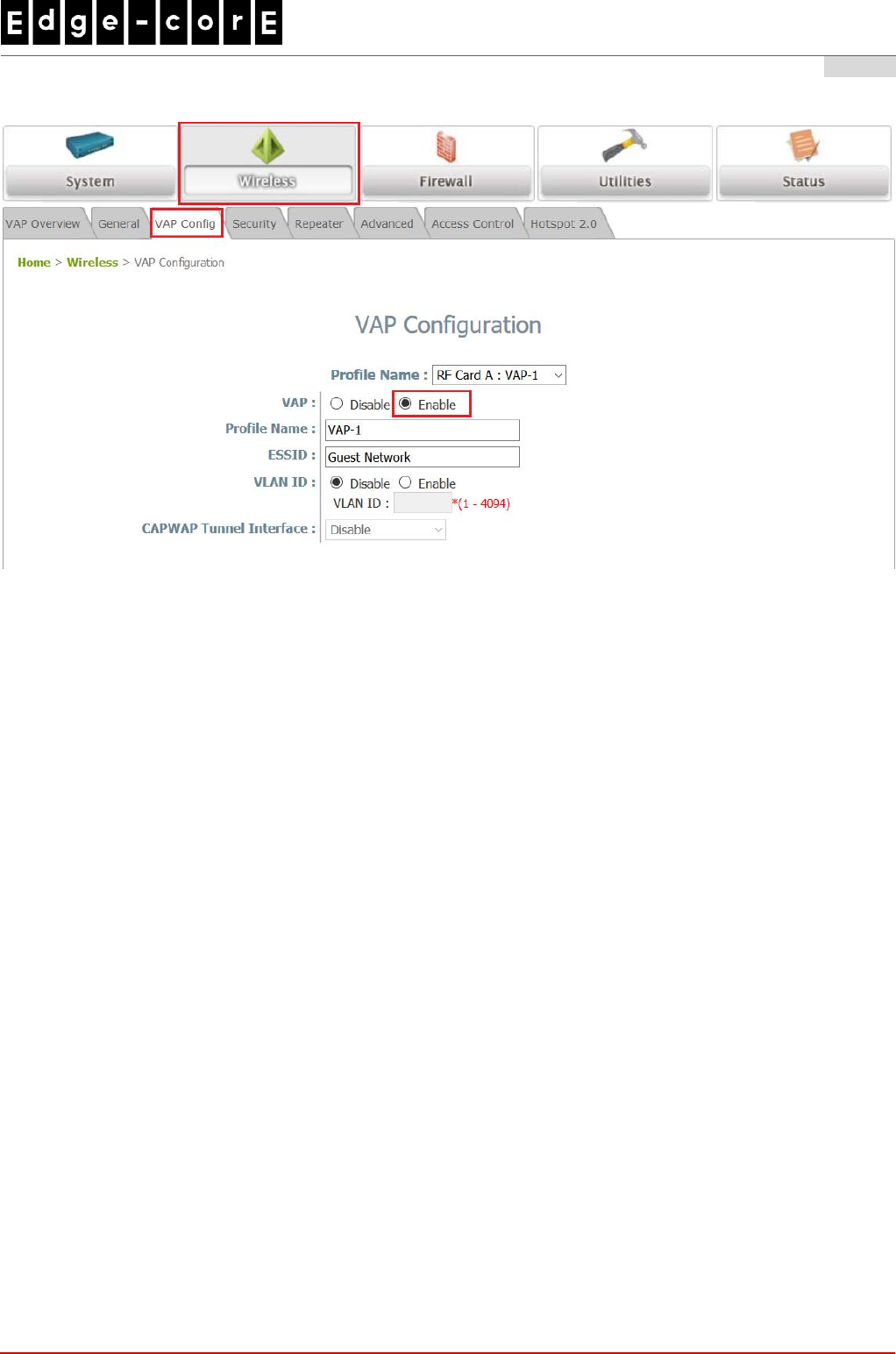 (b) Enable a specific VAP from the drop-down menu of Profile Name and configure related settings