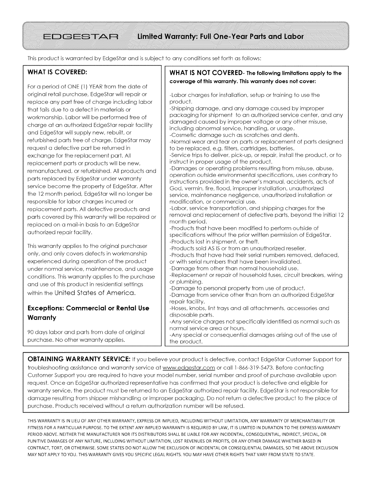 OBTAINING WARRANTY SERVICE: If you believe your product is defective, contact EdgeStar Customer Support for