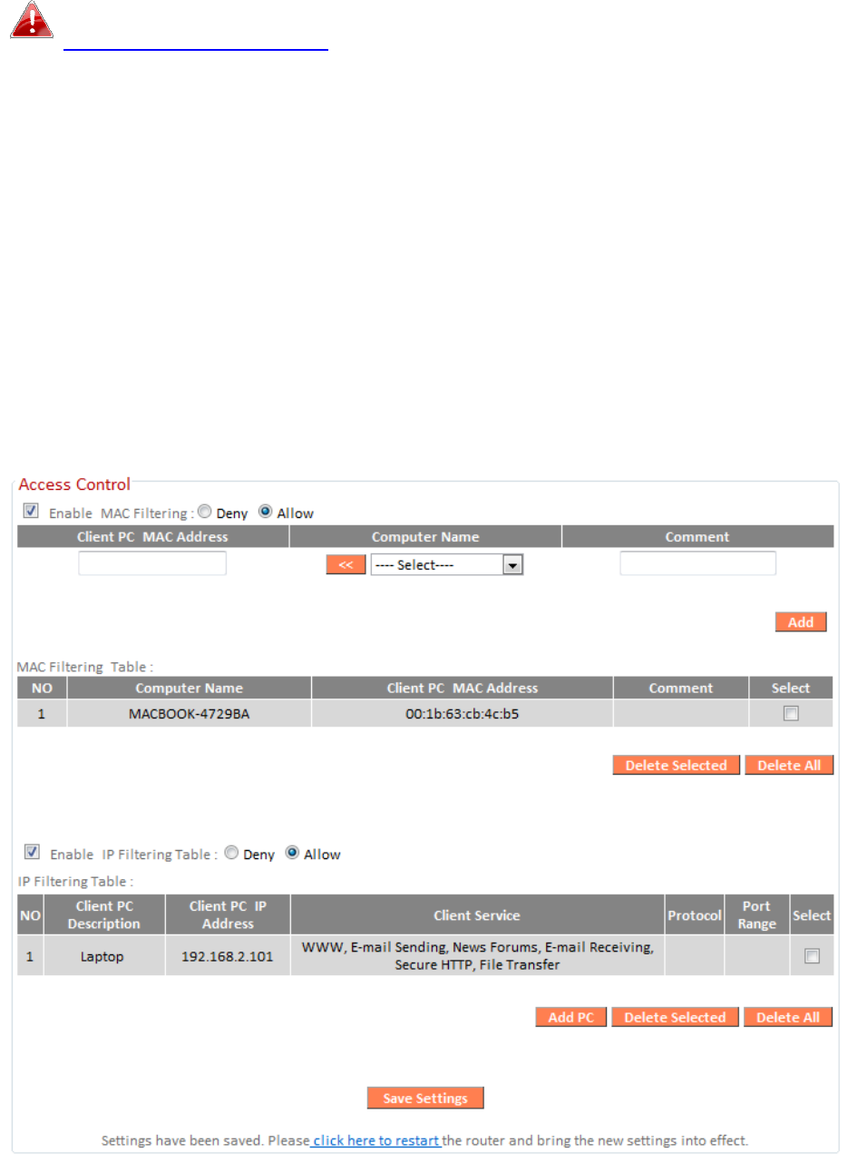 Check/uncheck the “Enable MAC Filtering” and/or “Enable IP Filtering” box to