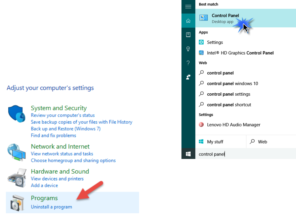 Programs and Features, Uninstall a Program or Add or Remove Programs feature.