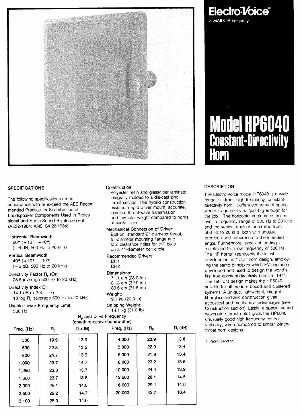Electro Voice Constant Directivity Horn Hp6040 Users Manual
