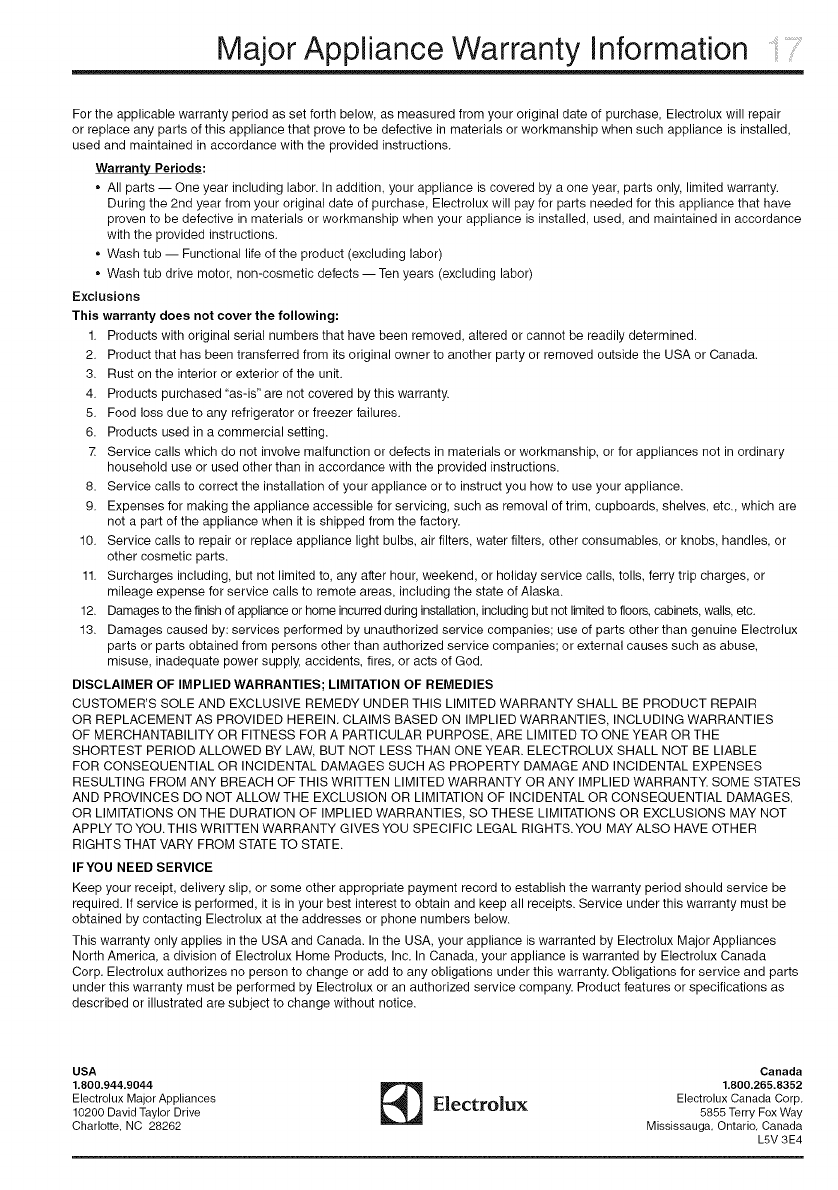 North America, a division of Electrolux Home Products, Inc. In Canada, your appliance is warranted by Electrolux Canada