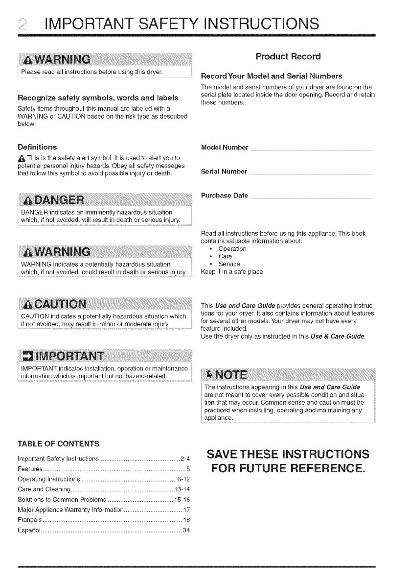if not avoided, may result in minor or moderate injury, for several other models. Your dryer may not have every