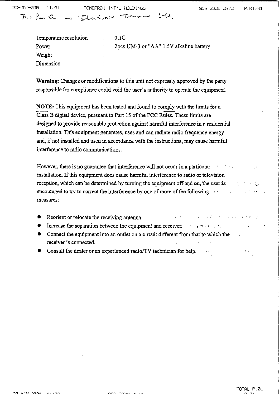Electronics Tomorrow 707090401 Battery Operated RF Clock Transmitter User Manual