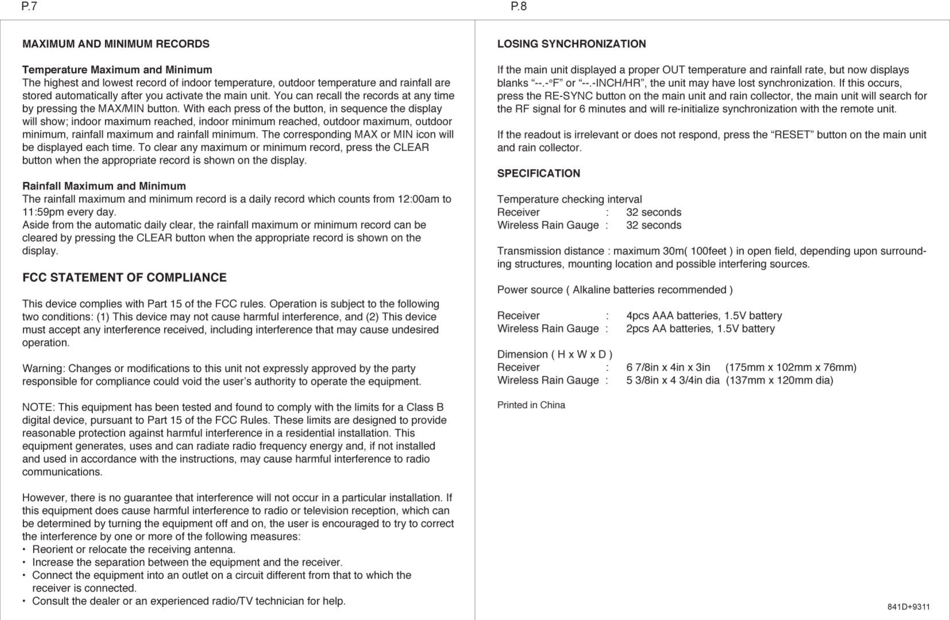 Electronics Tomorrow 841D60406 Thermo+RF Rain Gauge Weather Centre(433.92MHz Rx) User Manual