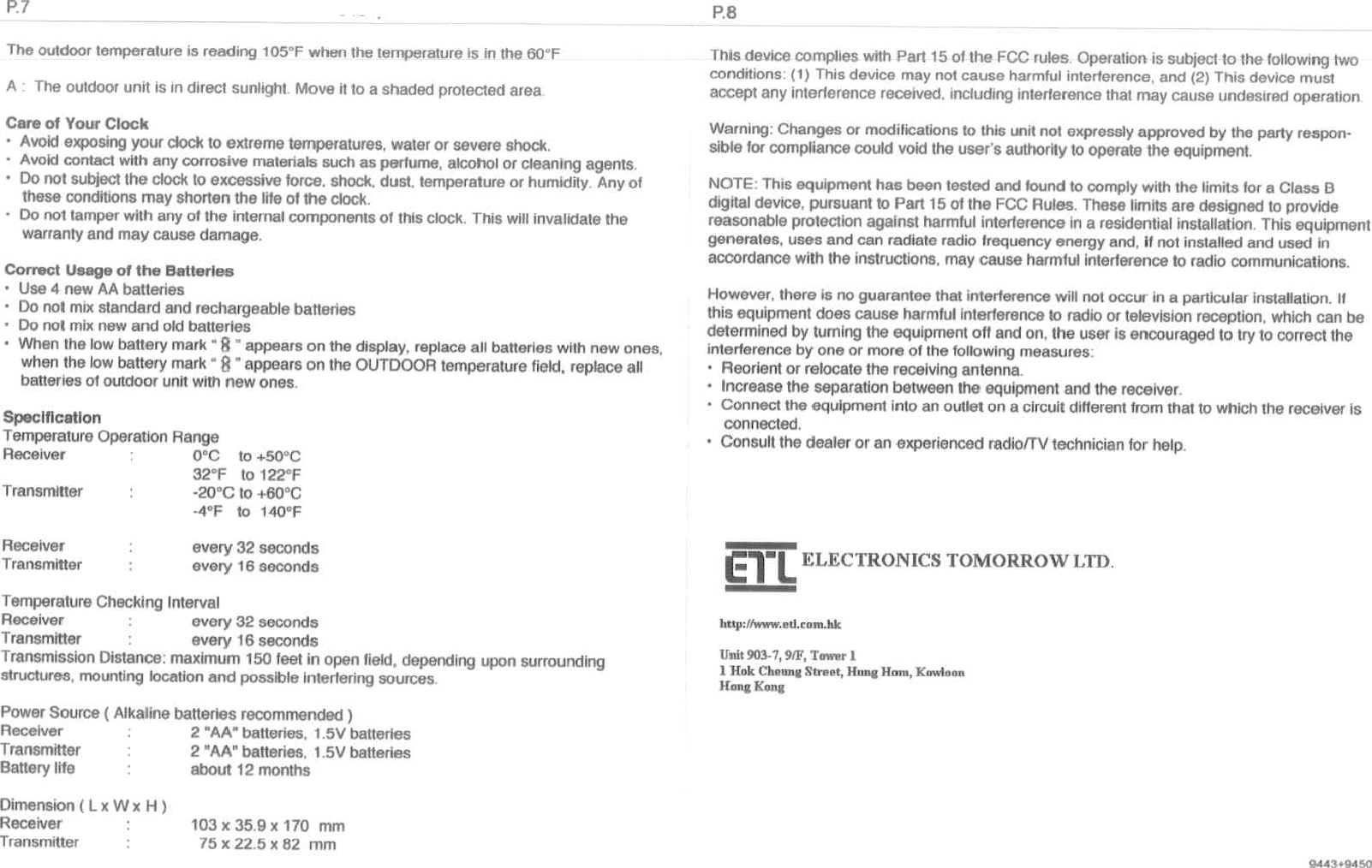 Electronics Tomorrow 945090807 RF Thermo/ Humidity with LCD User Manual