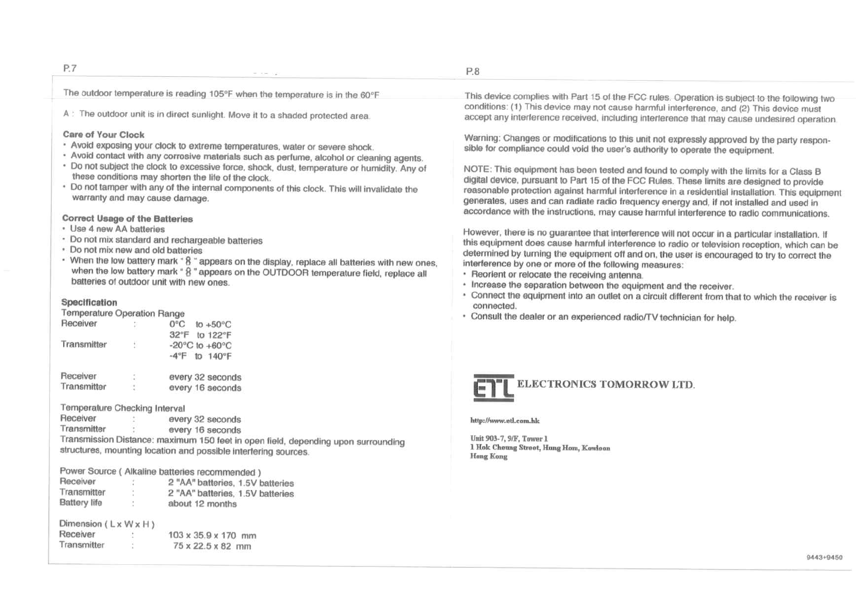 Electronics Tomorrow 945090807 RF Thermo/ Humidity with LCD User Manual