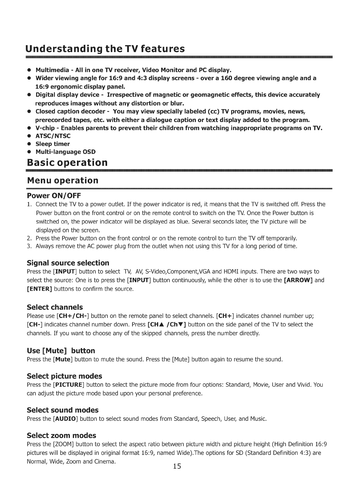 15, POWER SOURCE: This TV should be operated only from the type of power source indicated on the marking