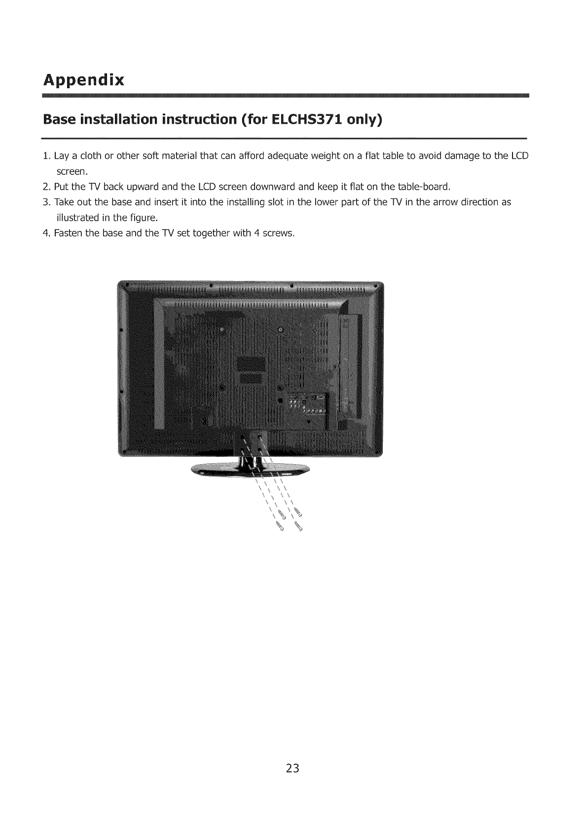 4. Fasten the base and the TV set together with 4 screws.