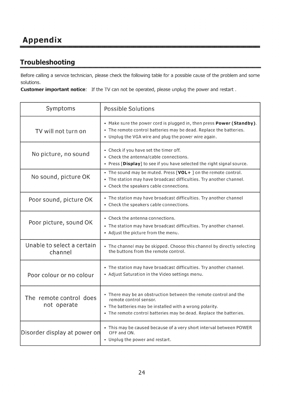 Before calling a service technician, please check the following table for a possible cause of the problem and some
