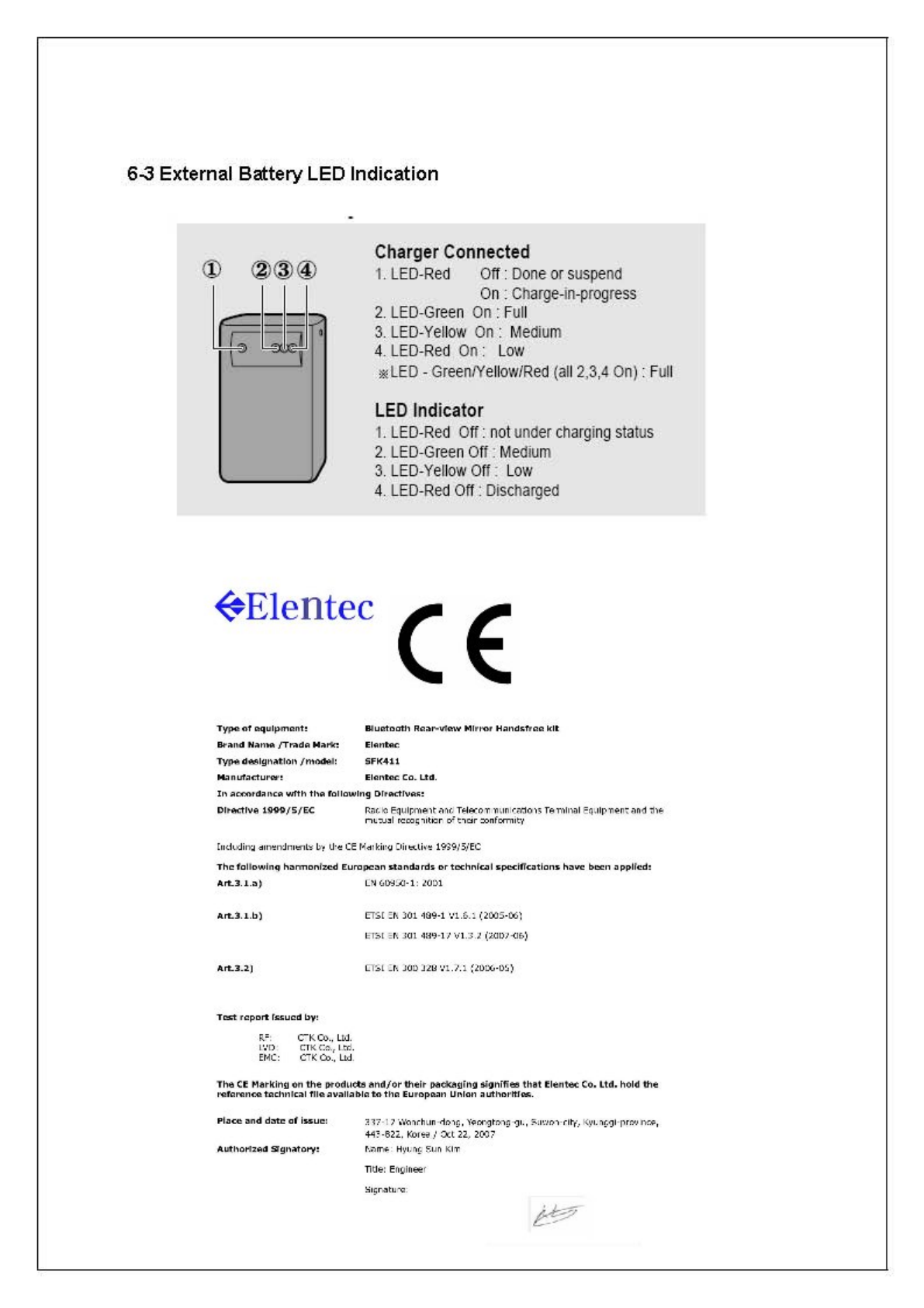 Elentec Co.,Ltd. Bluetooth Rear-view Mirror Handsfree kit SPECIFICATION