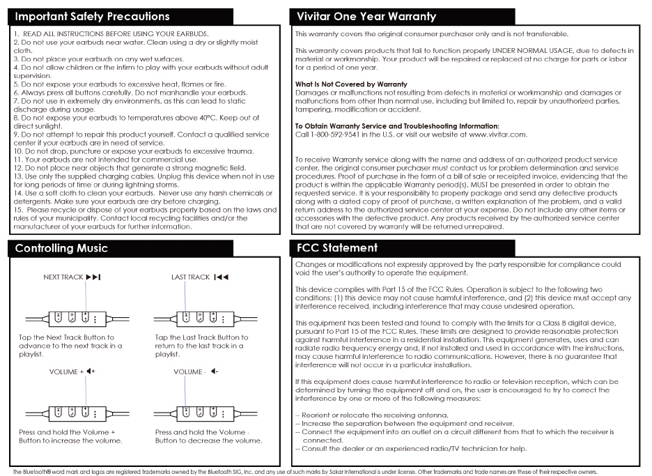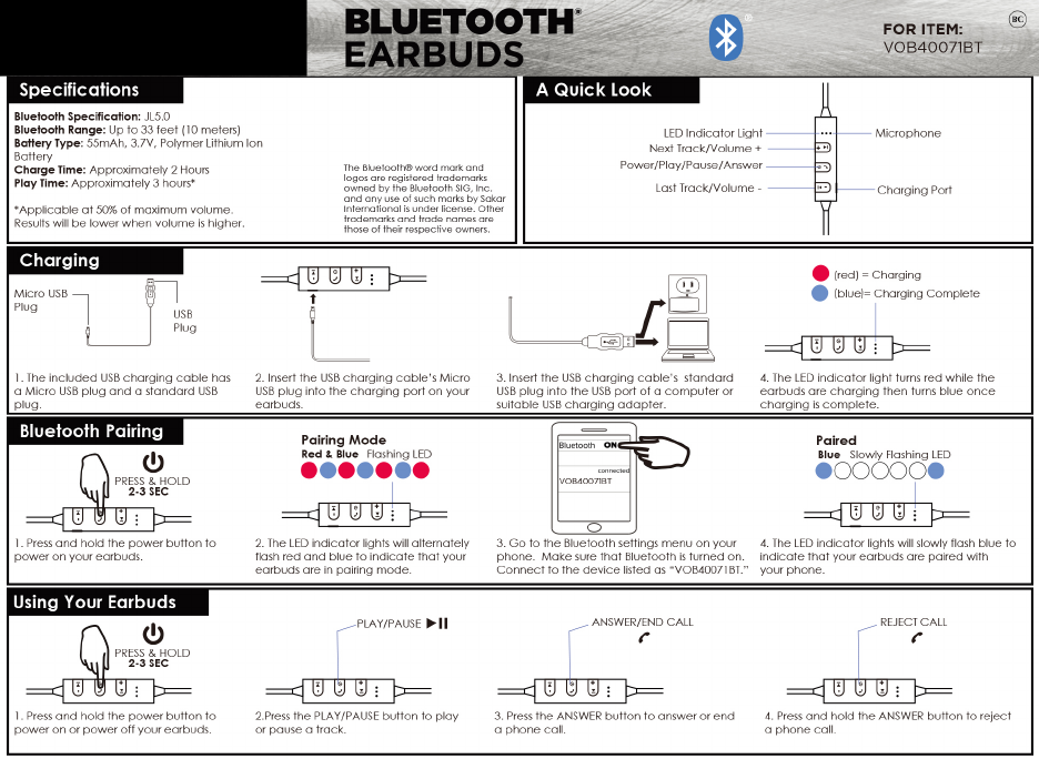 Elita VOB40071BT BLUETOOTH EARBUDS User Manual