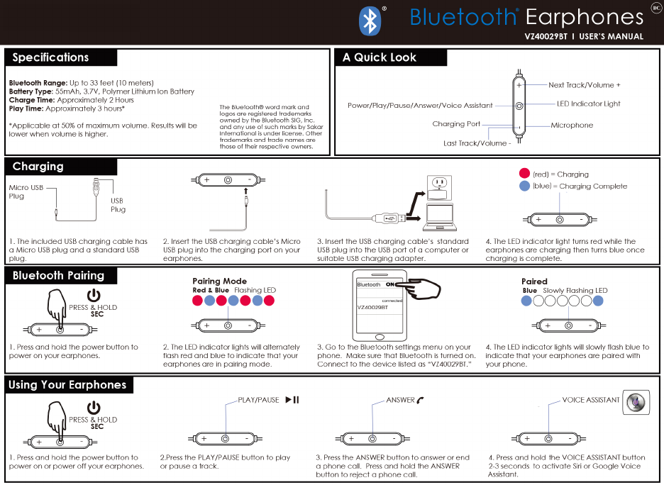 Elita VZ40029BT Bluetooth Earbuds User Manual VZ40029BT Manual