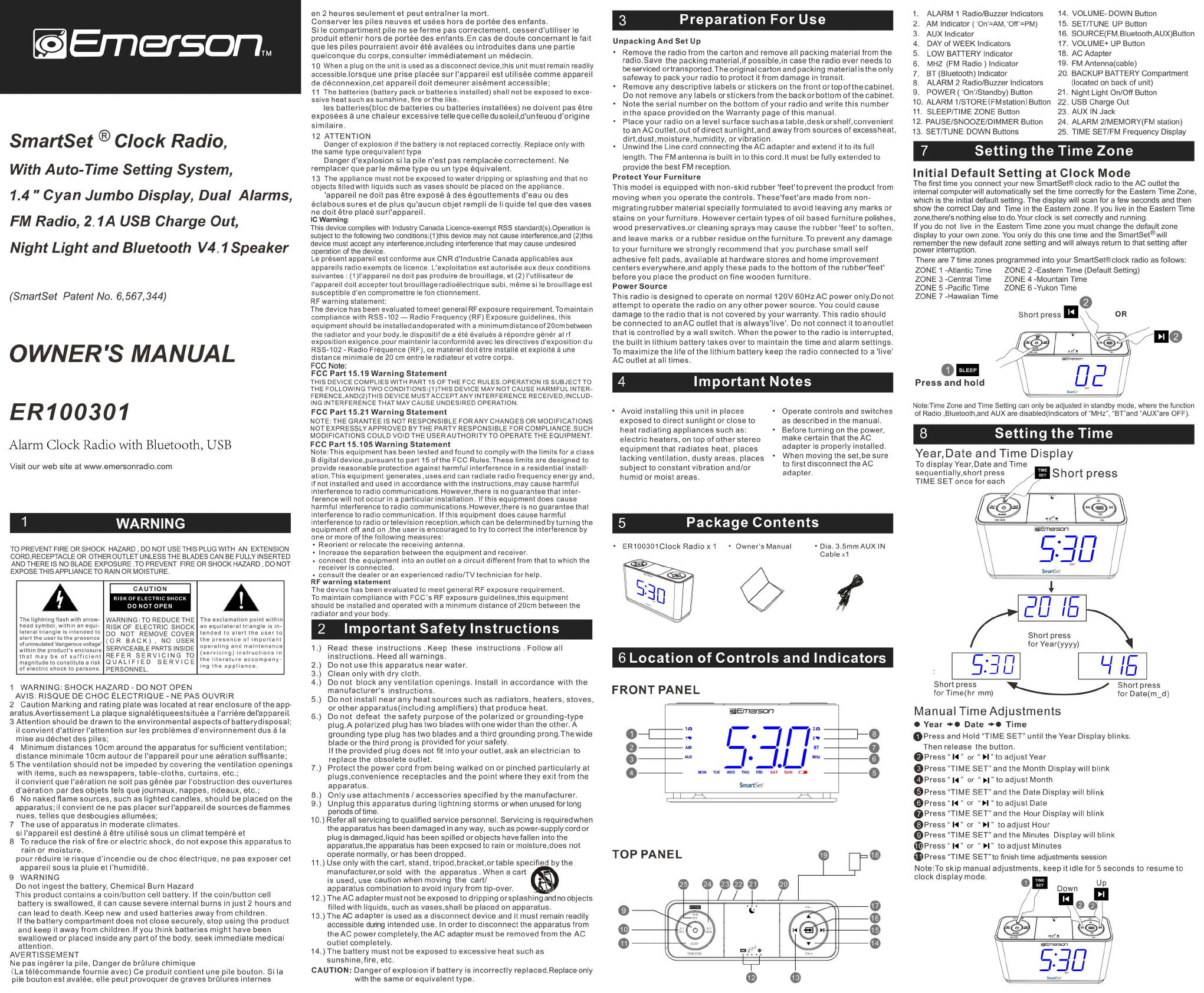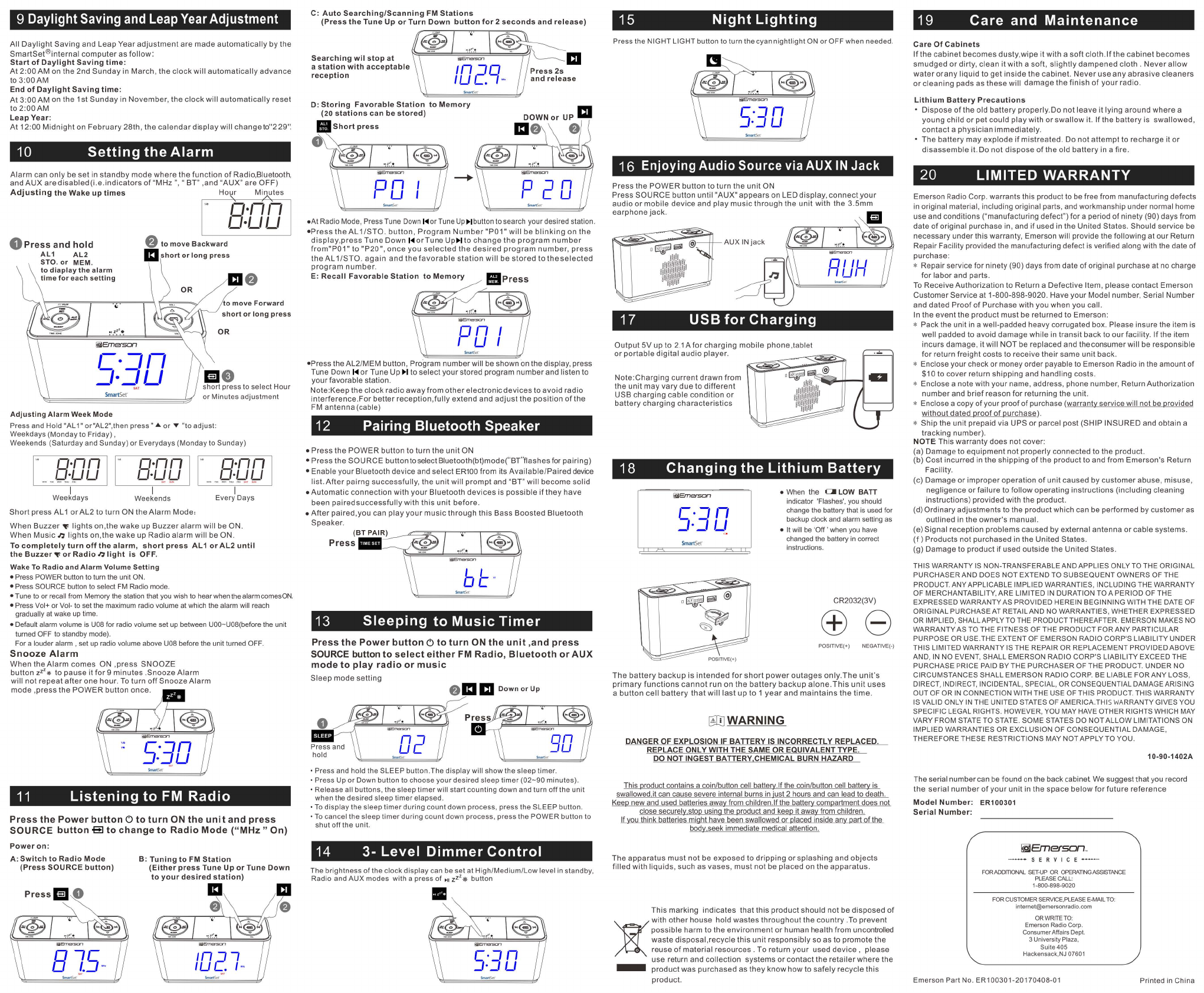 Emerson Radio ER1003 Alarm Clock Radio with Bluetooth, USB User Manual