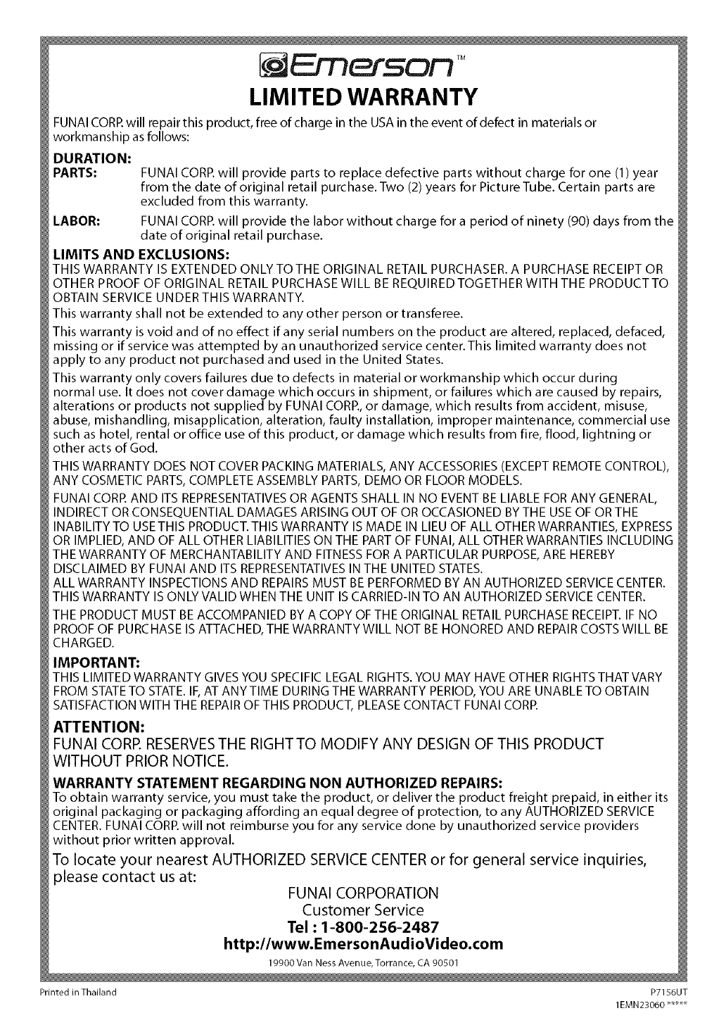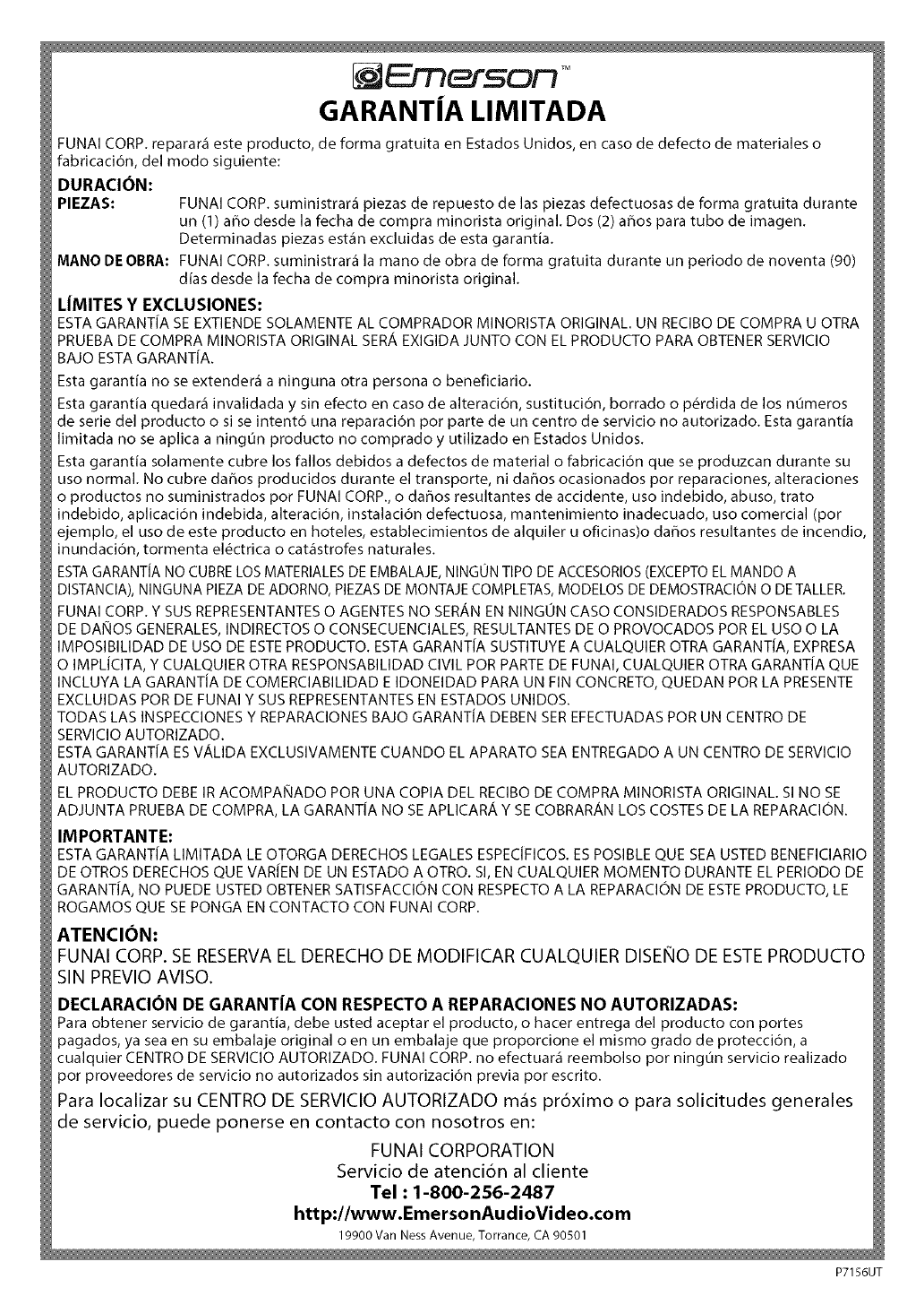 FUNAI CORP. reparar_ este producto, de forma gratuita en Estados Unidos, en caso de defecto de materiales o