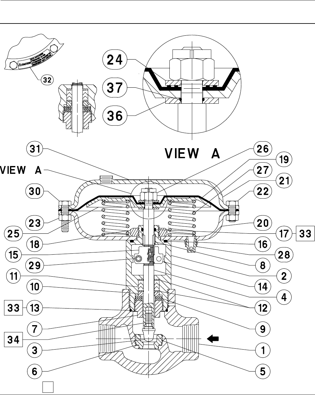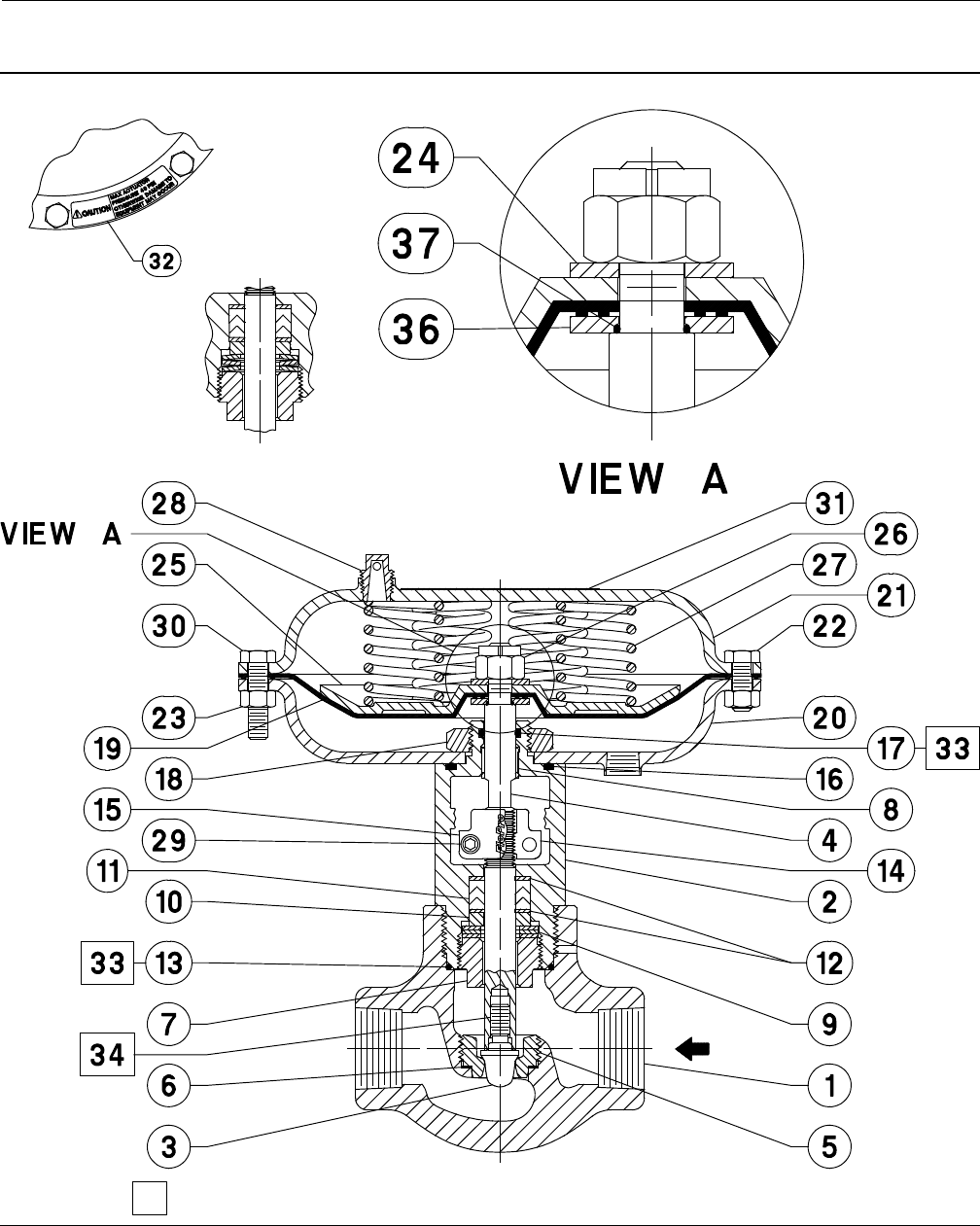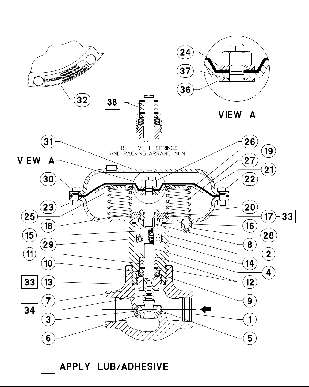 25) over the valve stem. Install the washer (key 24), diaphragm hex nut (key 26). Tighten the diaphragm hex nut to