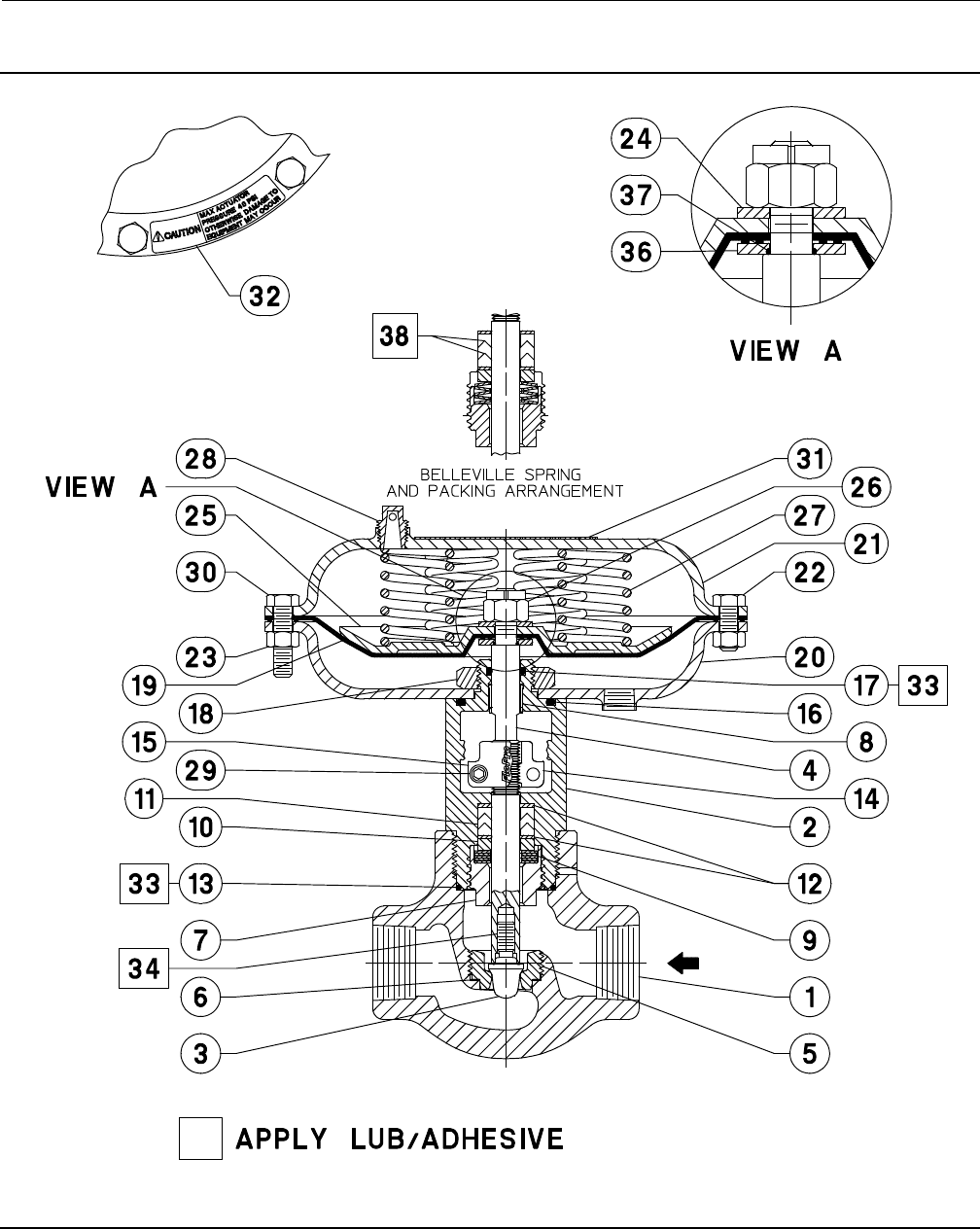 over the valve stem, as shown in view A of figure 11. Then place the O-ring (key 37) over the valve stem. Next install