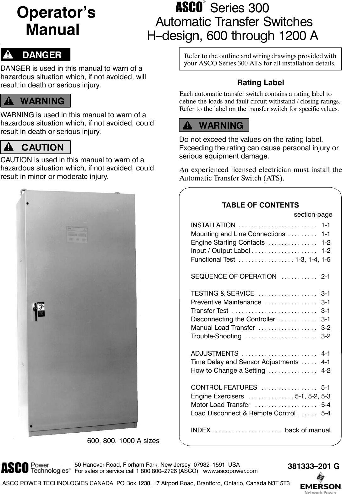 Emerson Series 300 Users Manual Operator's For ATS H 600 1200 A UL/CSA