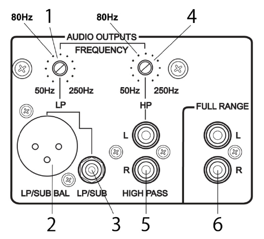 Low Pass = Variable 50Hz or 250 Hz @ 12dB/Octave, Summed L+R Mono