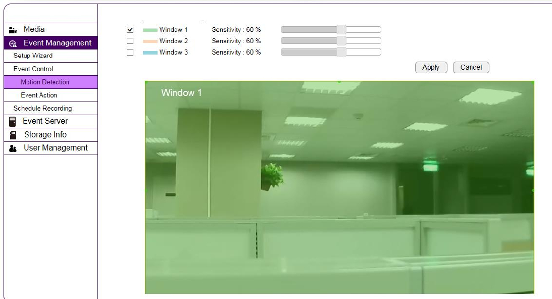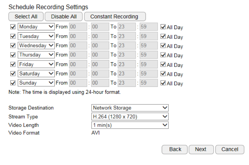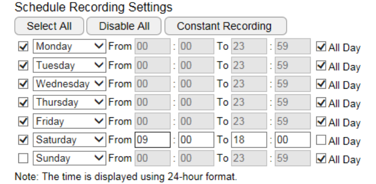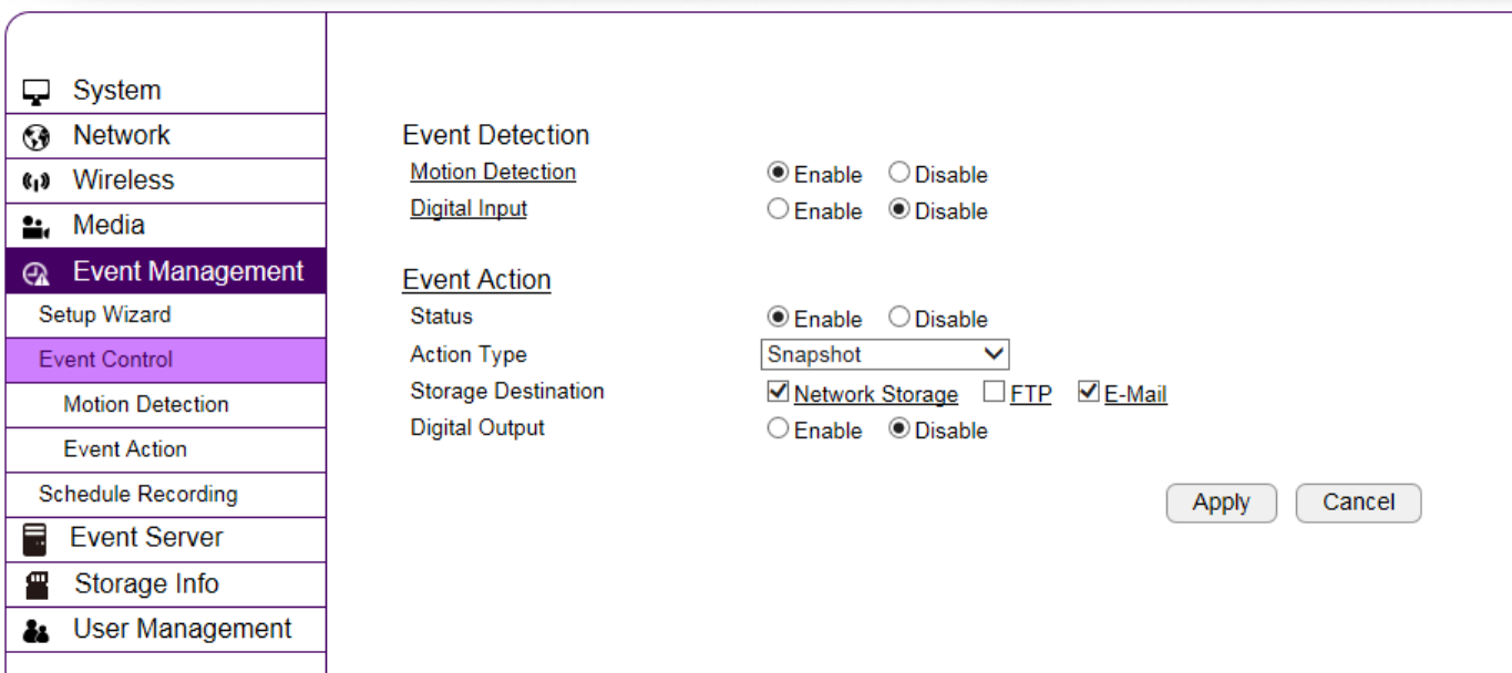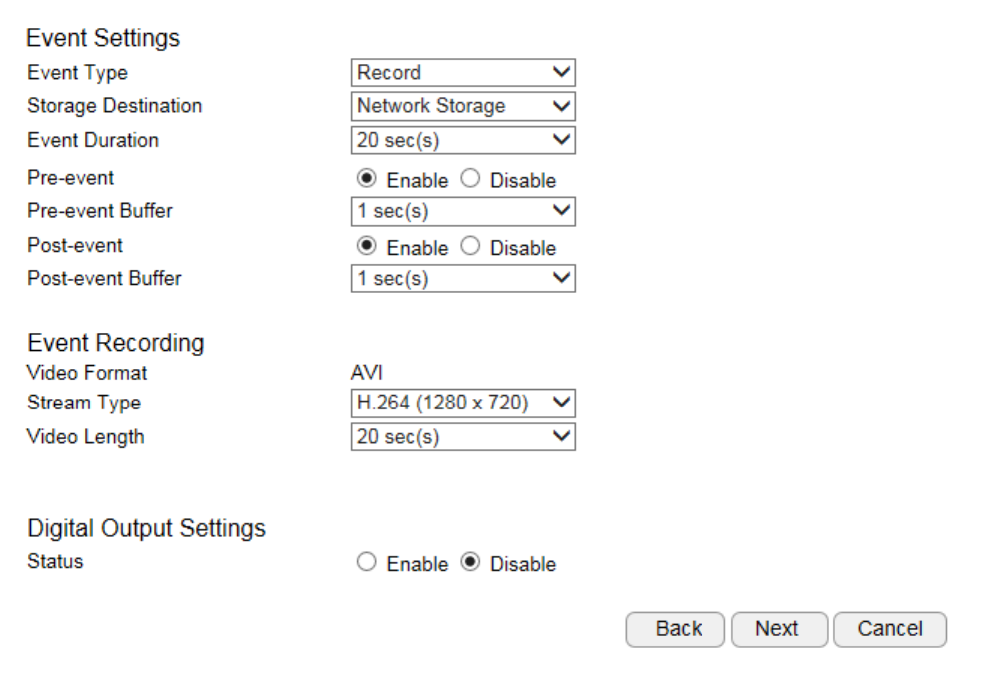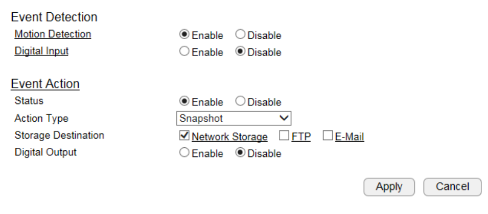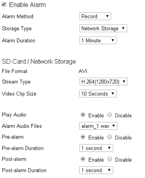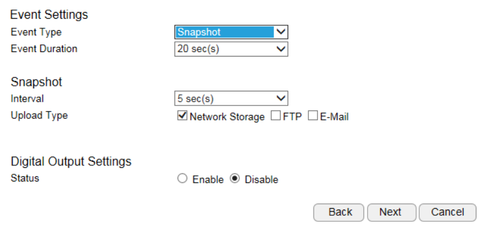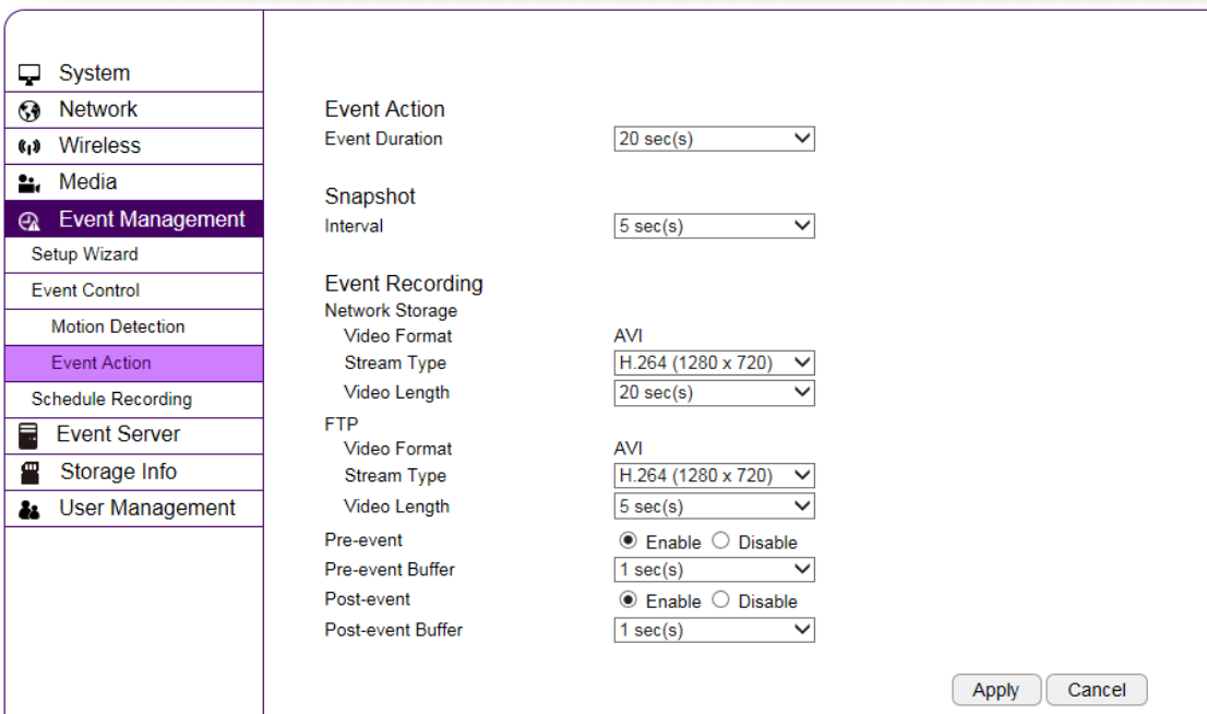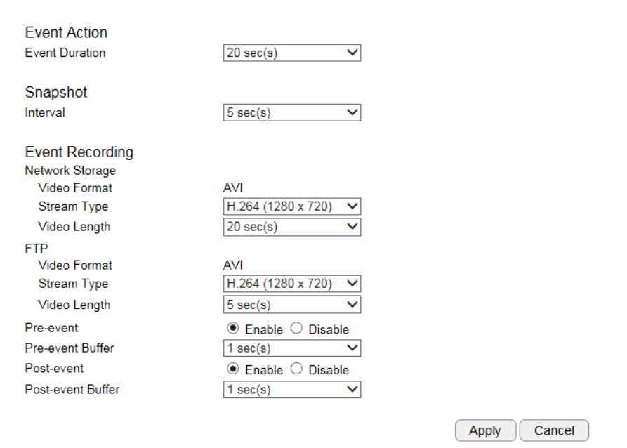 Select desired Event Duration and Interval; if you enable Event Recording via available methods such as Network Storage or FTP, please also
