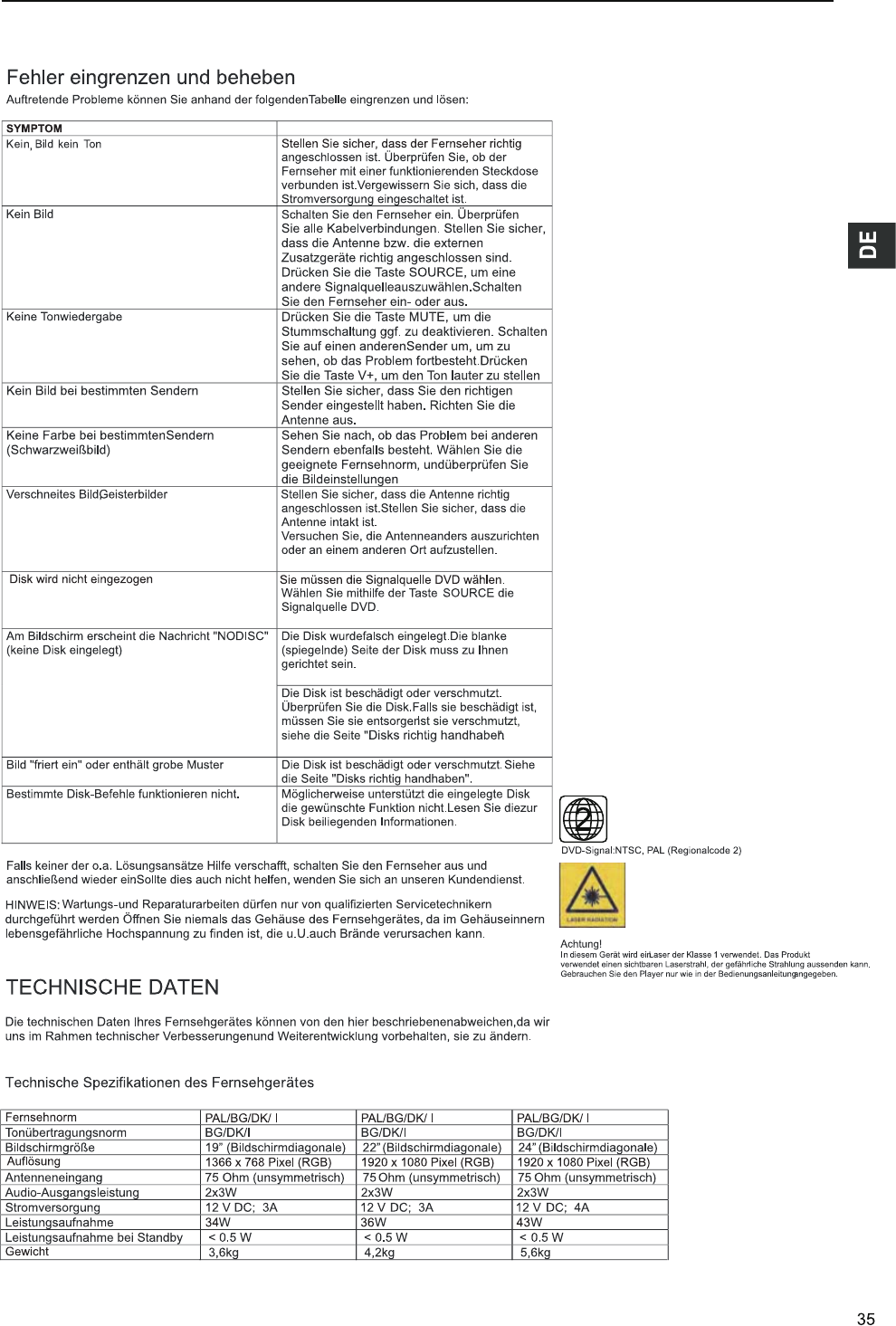 Technische Spezifikationen des Fernsehgerätes ....................................................................35