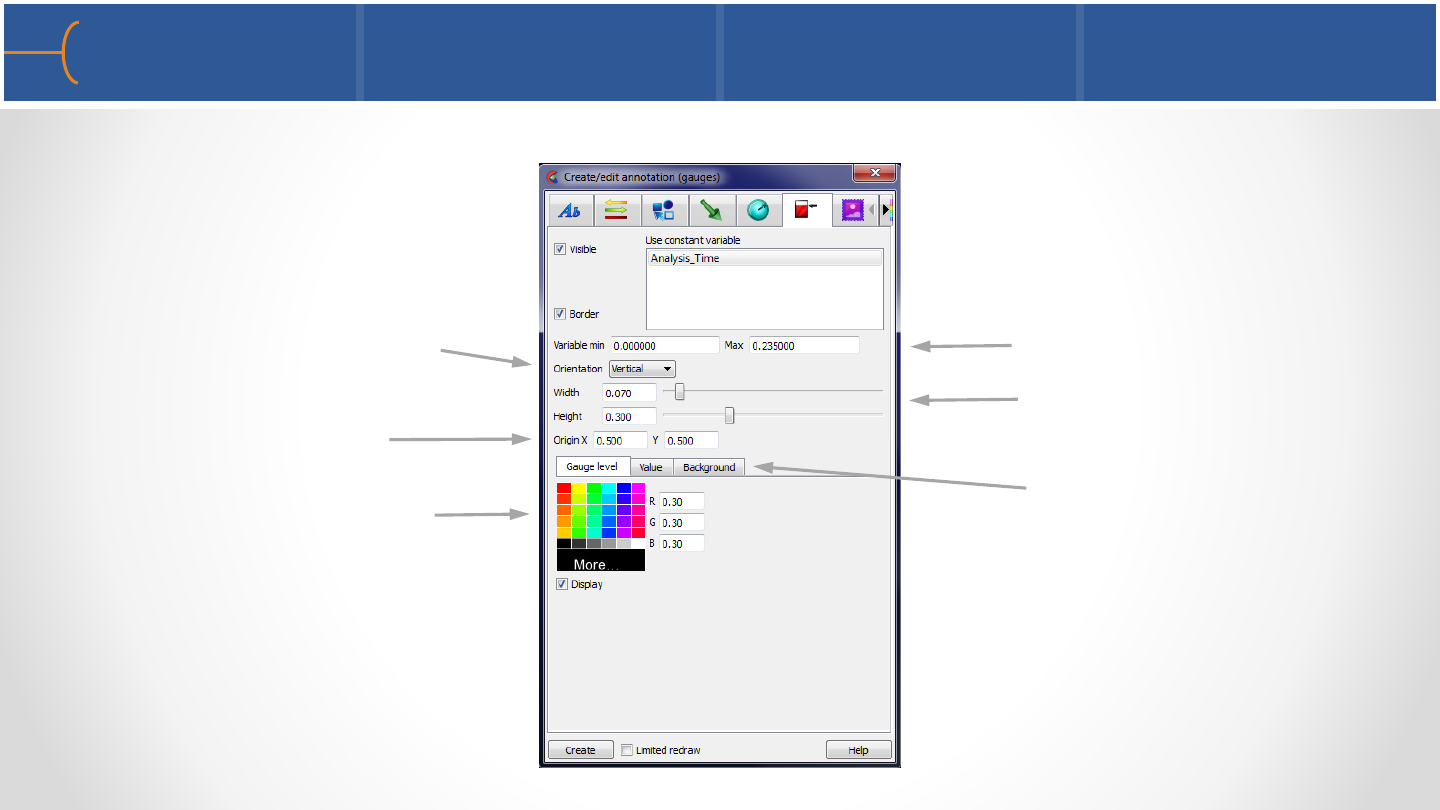 •Similar to a dial, EnSight can display a 2D gauge tied to a constant variable