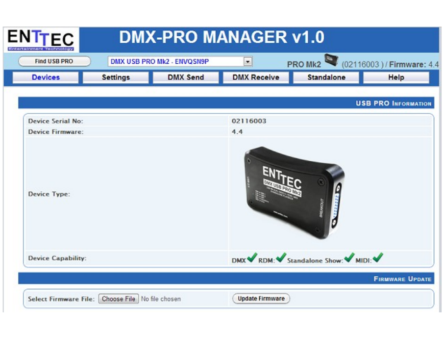 ENTTEC provides a free cross-platform app to configure, test and update the PRO Mk2. It