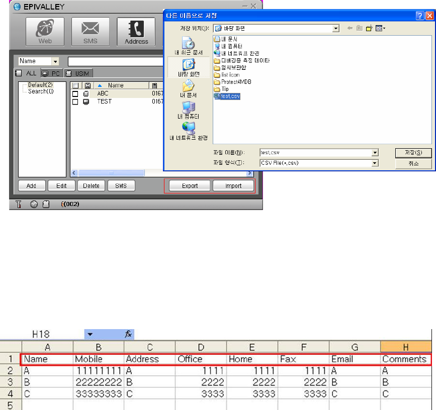 export, import 버튼을 클릭하여 나타나는 대화상자를 통해 csv 파일형태로