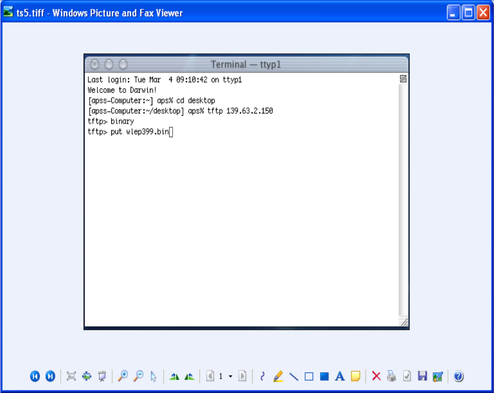 At the tftp> prompt type put <WLEP399.bin file name> then press RETURN