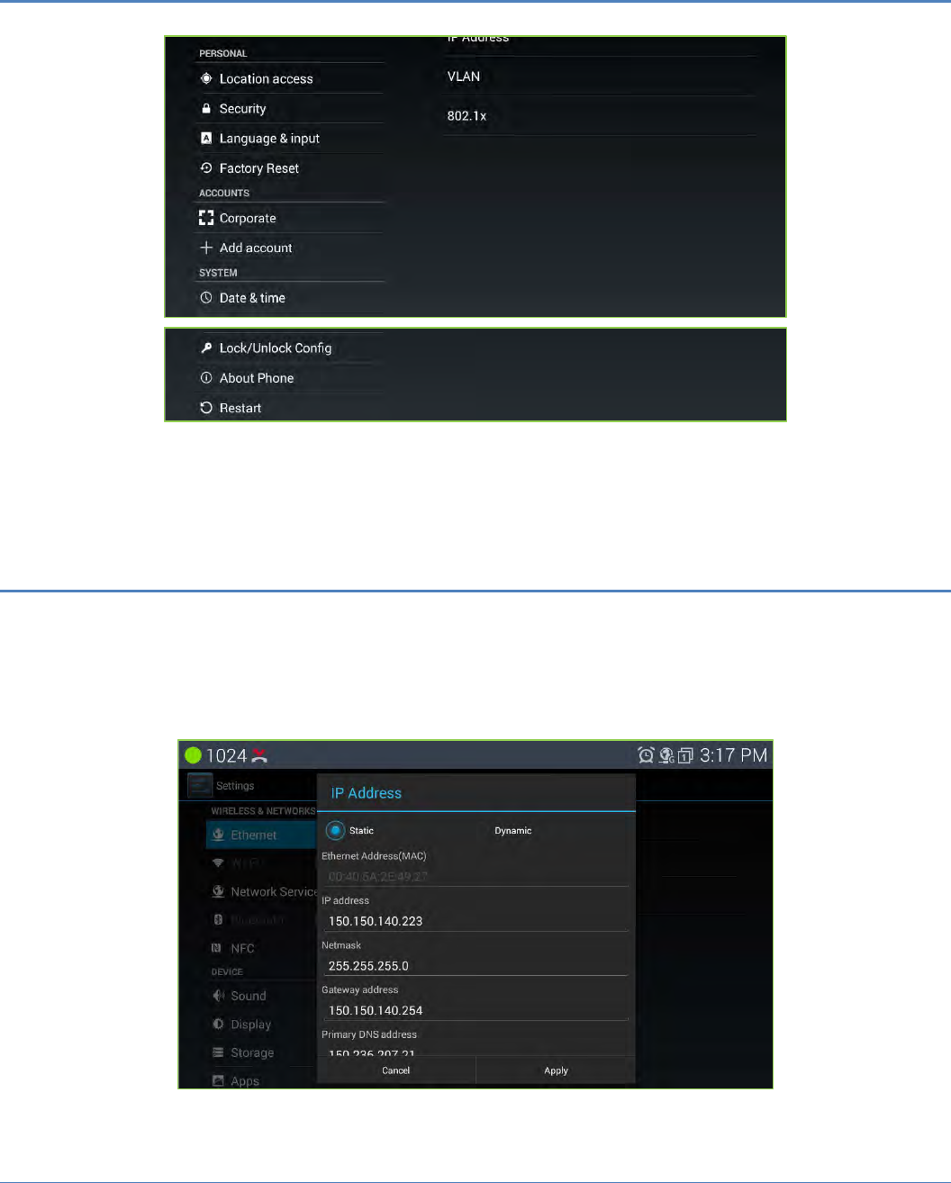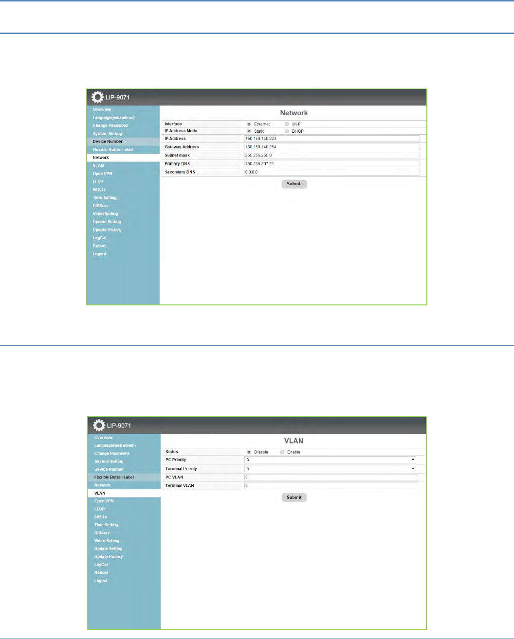 The Network Setting menu configures the address Mode, Static or Dynamic. If static addressing is employed, the