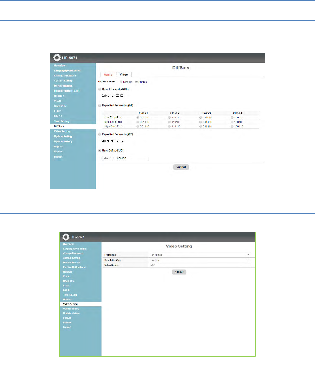 The Diffserv (Audio / Video) menu establishes the DSCP applied to Audio/video packets only. DSCP or ToS