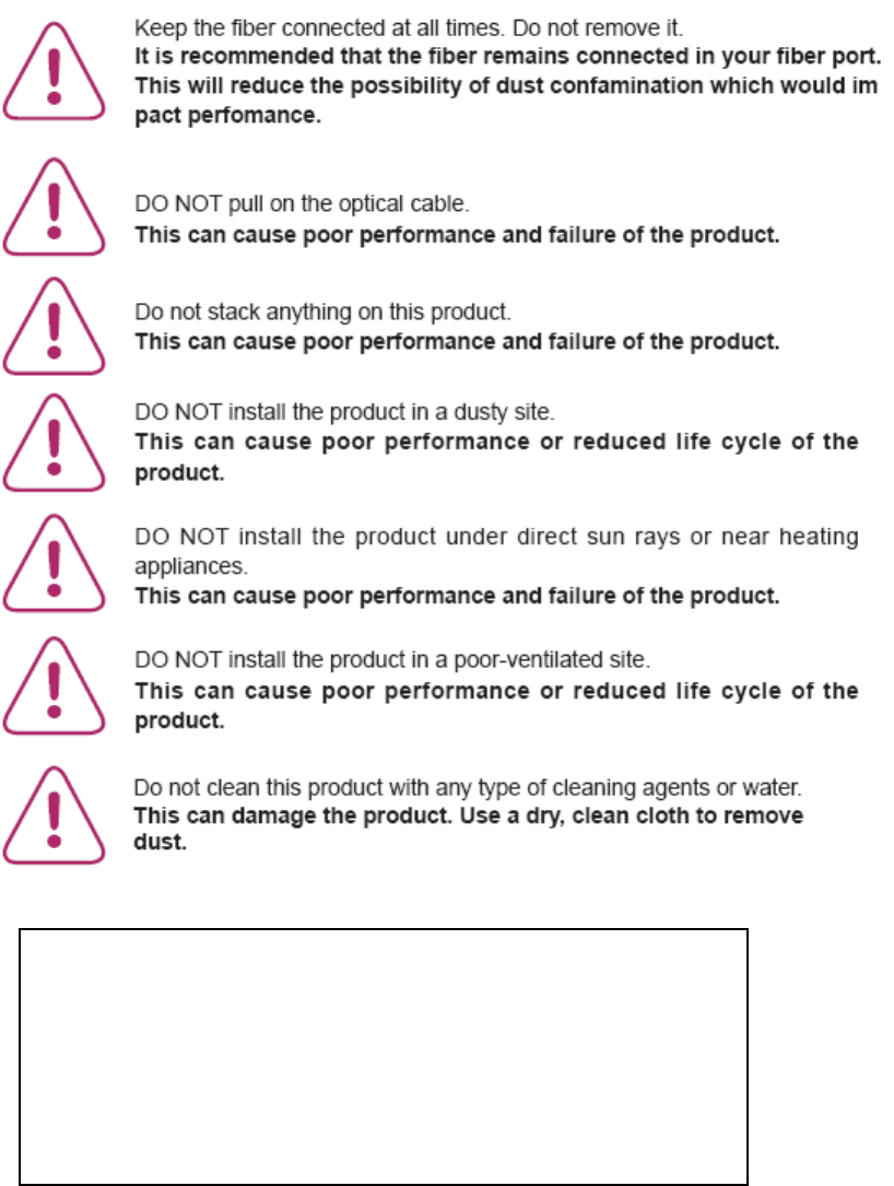 • Handle optical fibers with caution. Place the optical fibers in a safe location during