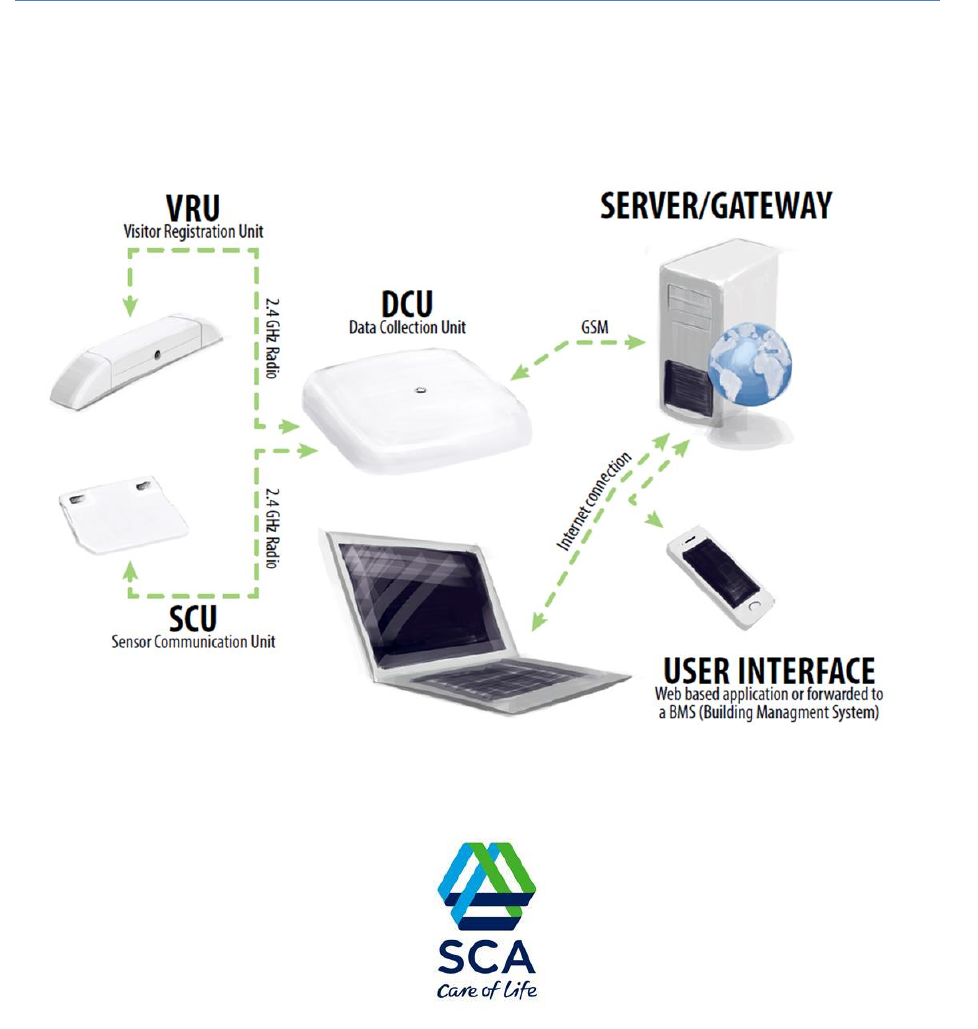 SCA Hygiene Products AB The Tork EasyCube Data Colletion Unit (DCU) communicates via 2.4 GHz radio with the sensor units in the Tork EasyCube system and collects and filter data to be sent to a server via GSM network. Tork EasyCube