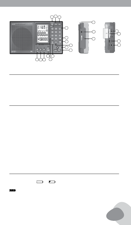 1. Long Press: Power On/Off; Press: Change between Radio and MP3