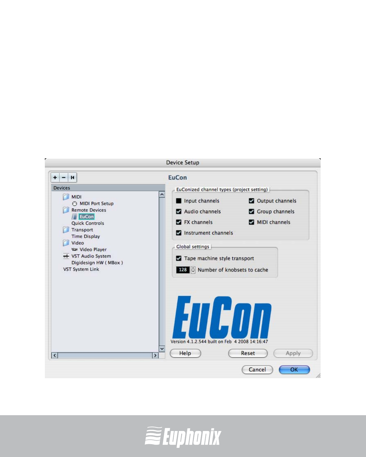 assignment and transport control parameters. If the EuCon Device setup dialog
