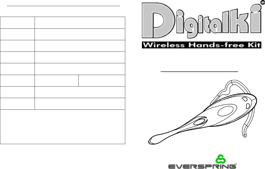 Everspring Industry Co Ltd Wireless Hands-Free Kit Base Unit users manual