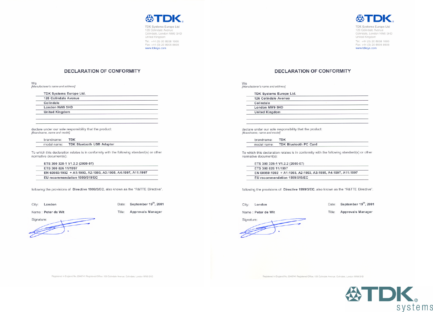 TDK warrants that the Bluetooth USB Adaptor and Bluetooth PC Card products shall conform to TDK’s published specifications, which