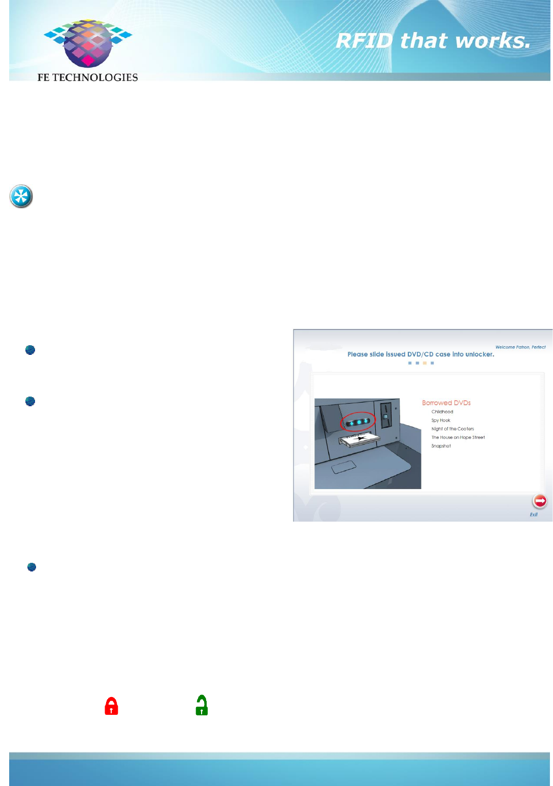 RFID reading platform and instruction insert. A DVD unlocking unit, coin acceptor and EFTPOS