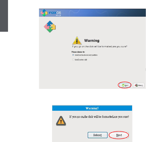 3 Select "Next", system warns the root partition(hd0, 0) will be formatted. The gure is