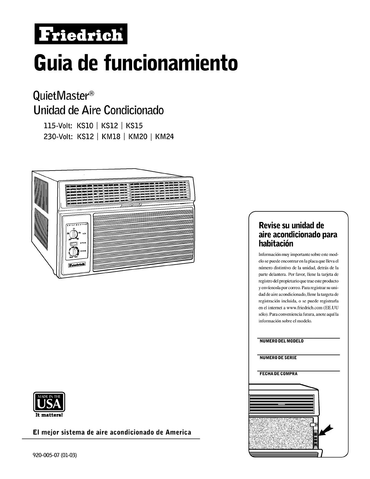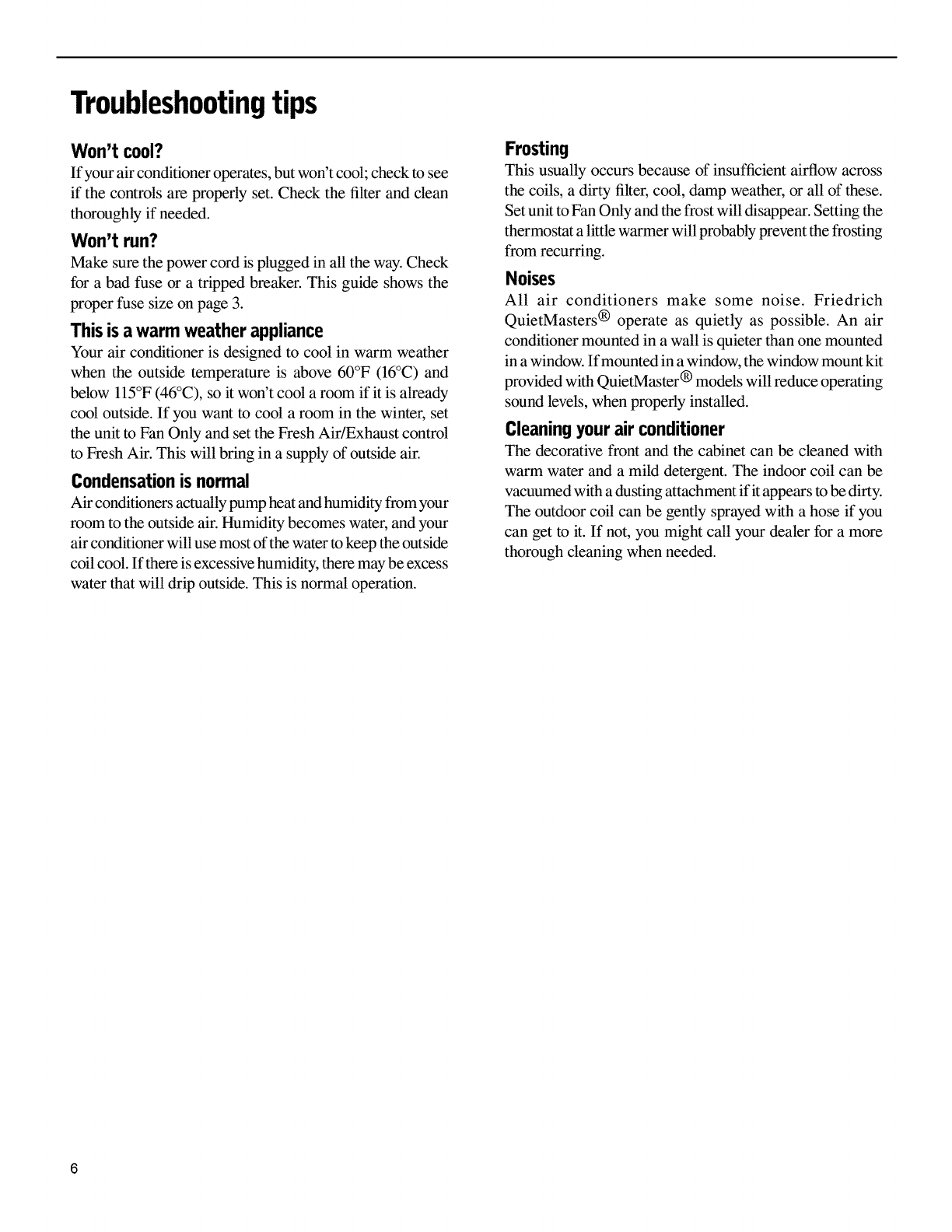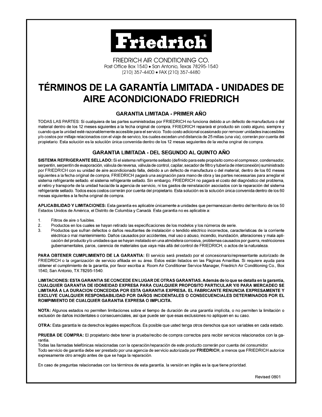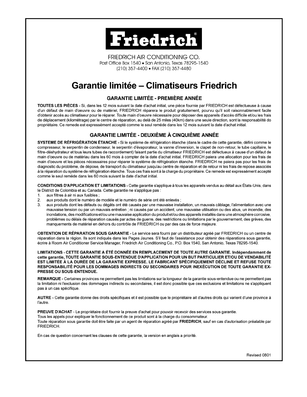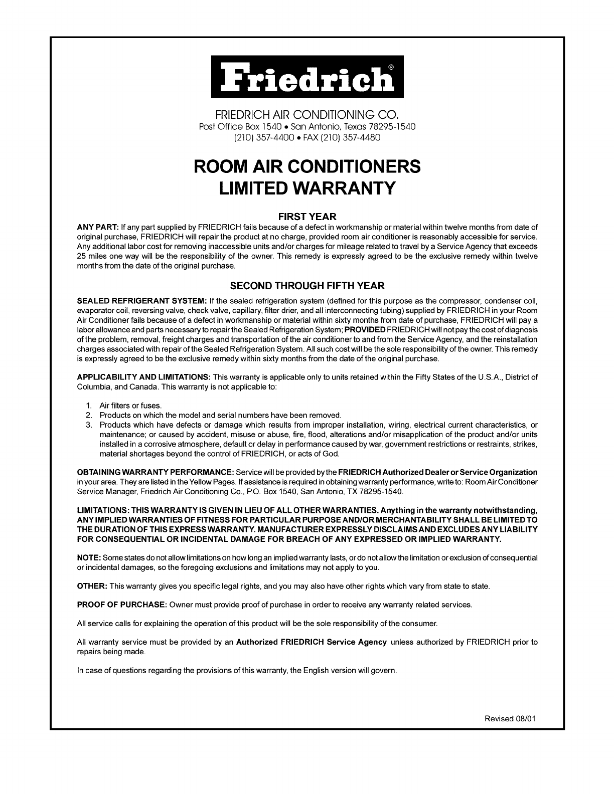 ecrire a Room Air Conditioner Service Manager, Fdedrich Air Conditioning Co., P.Q. Box 1540, San Antonio, Texas 78295-1540.
