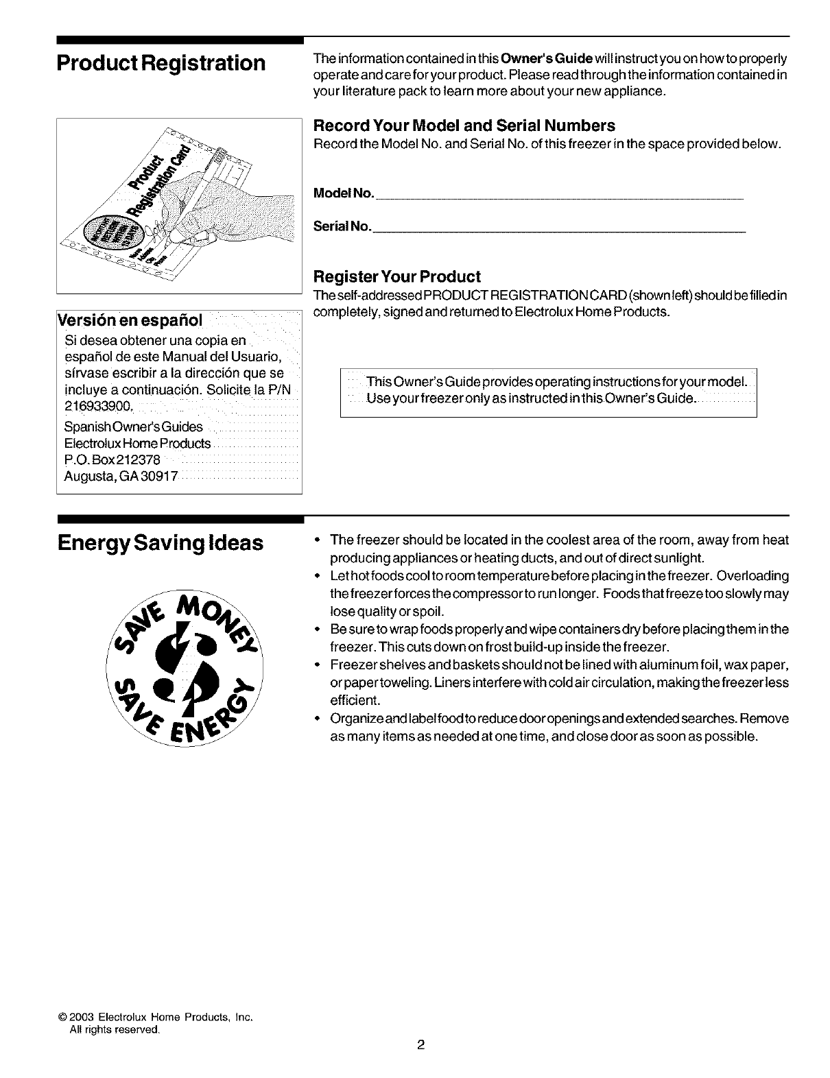 Record the Model No. and Serial No. of this freezer in the space provided below.