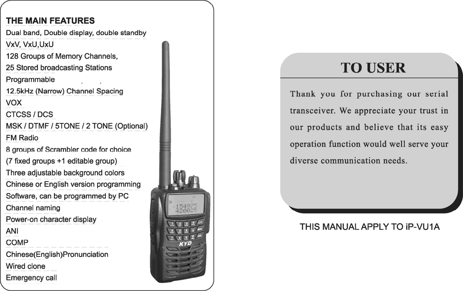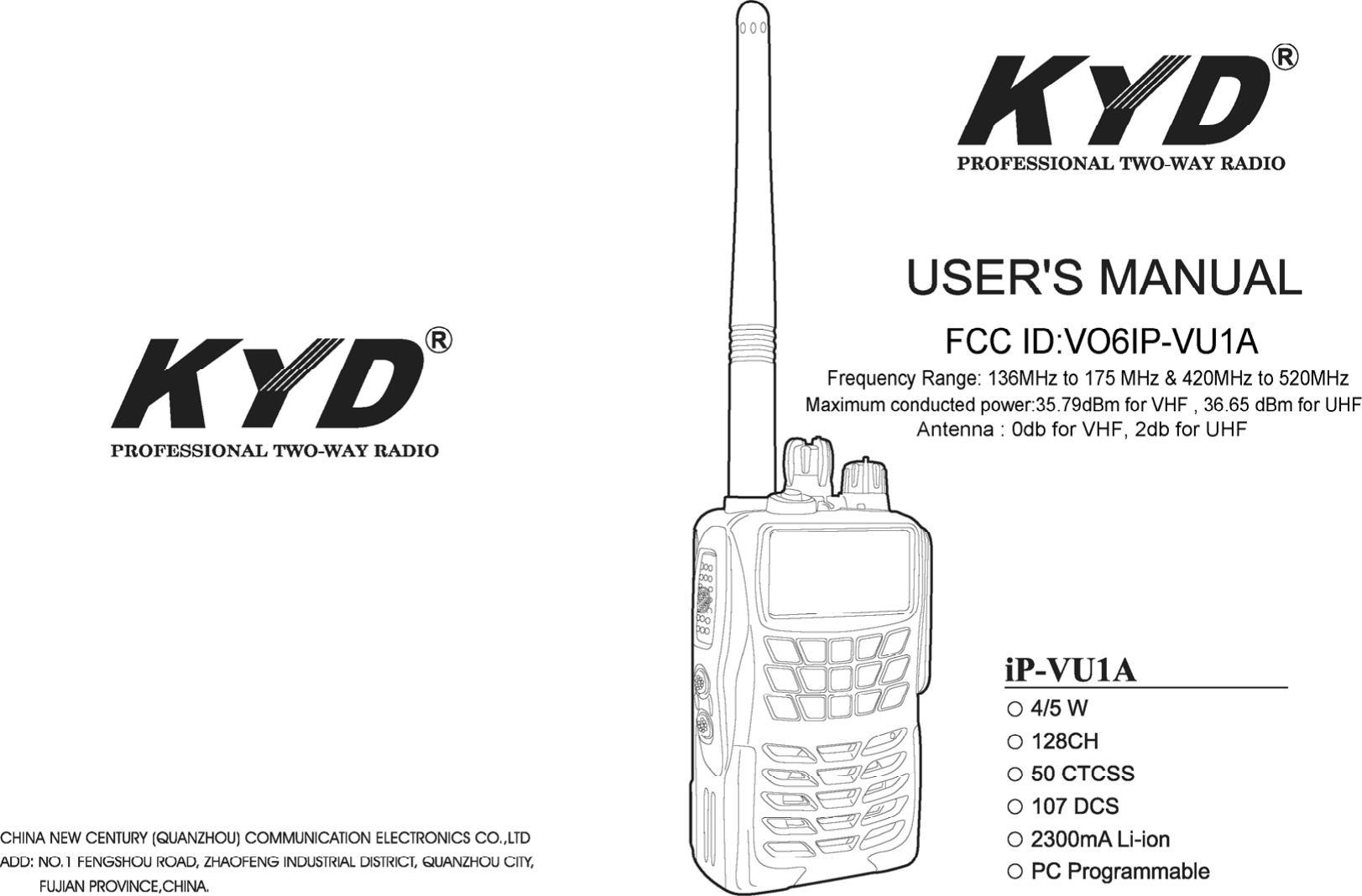 FUJIAN NEW CENTURY COMMUNICATIONS IP-VU1A Handheld Two Way Radio User Manual USER S MANUAL 1