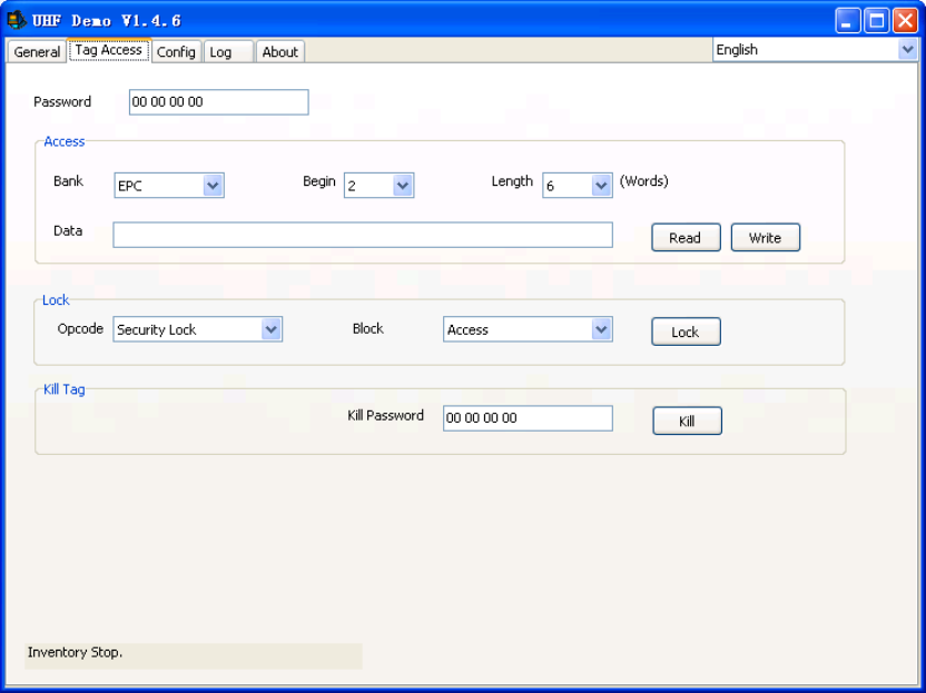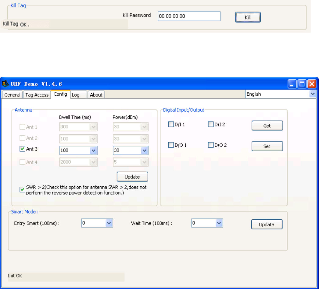 Logout Tag Operation: firstly set password of tags to kill, the password cannot be “00 00 00 00” .Click “Kill”and you will