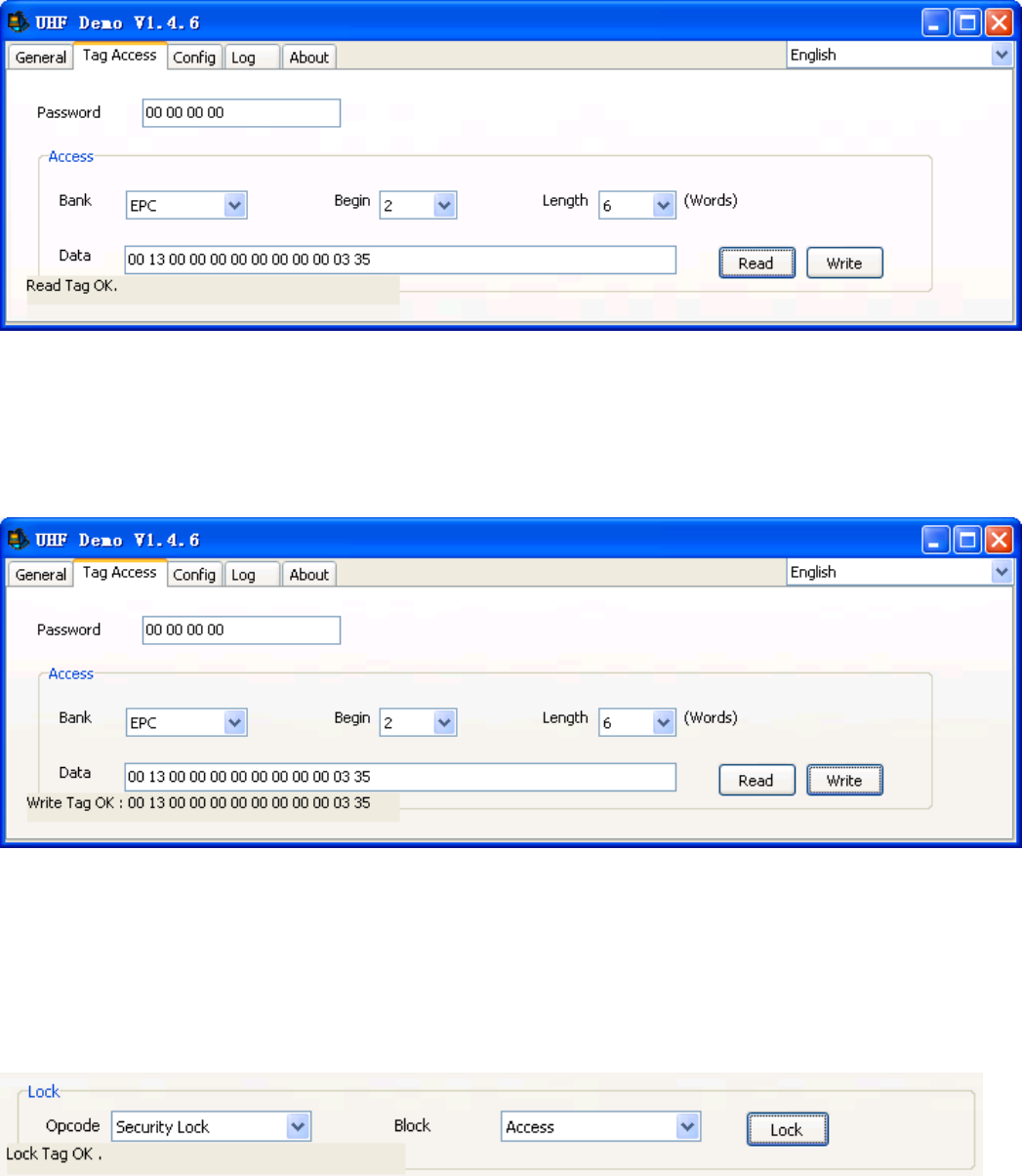 Set password of tags to lock, select corresponding operation and password, click “Lock”. If it is successful, you will see