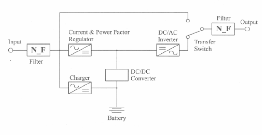 This UPS operates from utility power and contains a number of high current back-up batteries,