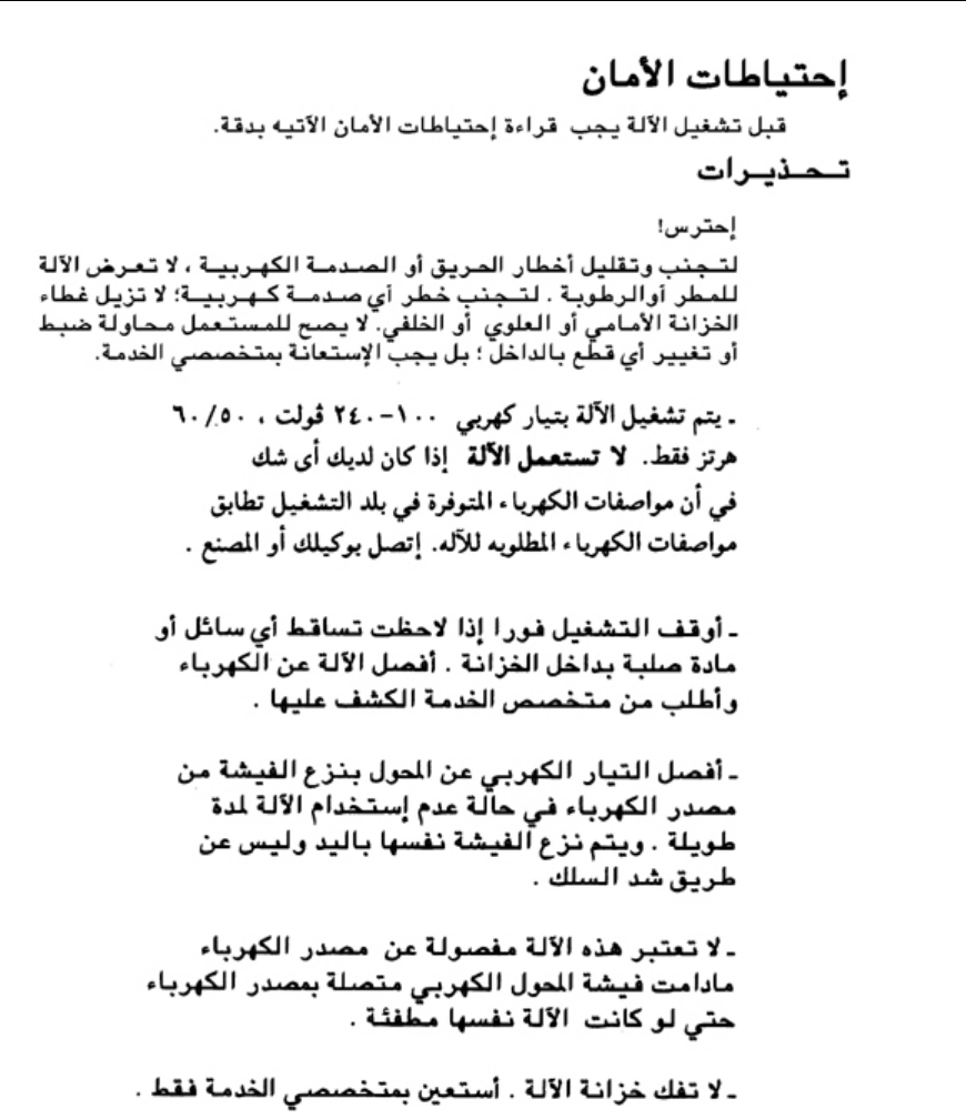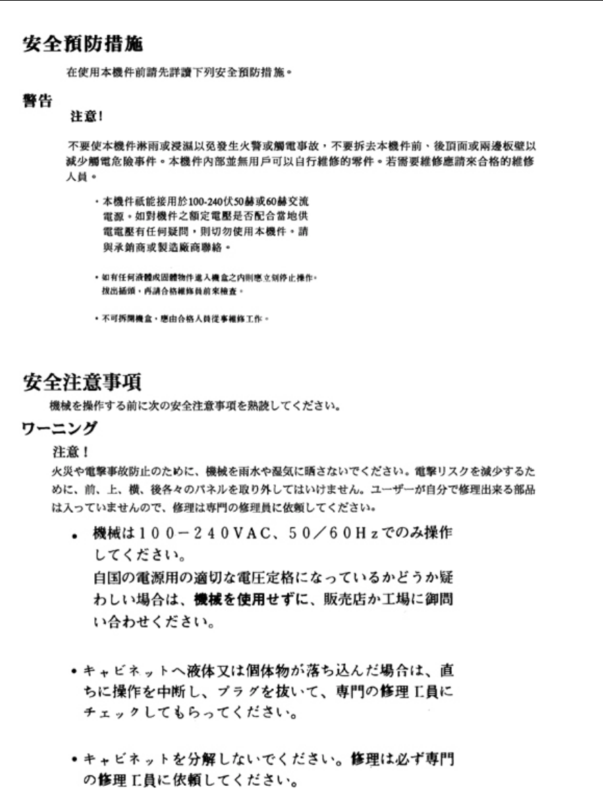 Stop operation immediately if any liquid or solid object should fall into the cabinet.