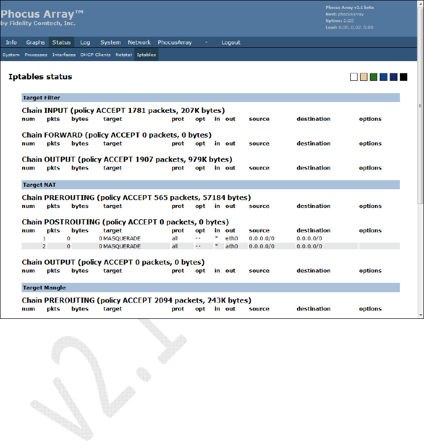 The screen displays the status for each Iptable, including Target filter, Target NAT,
